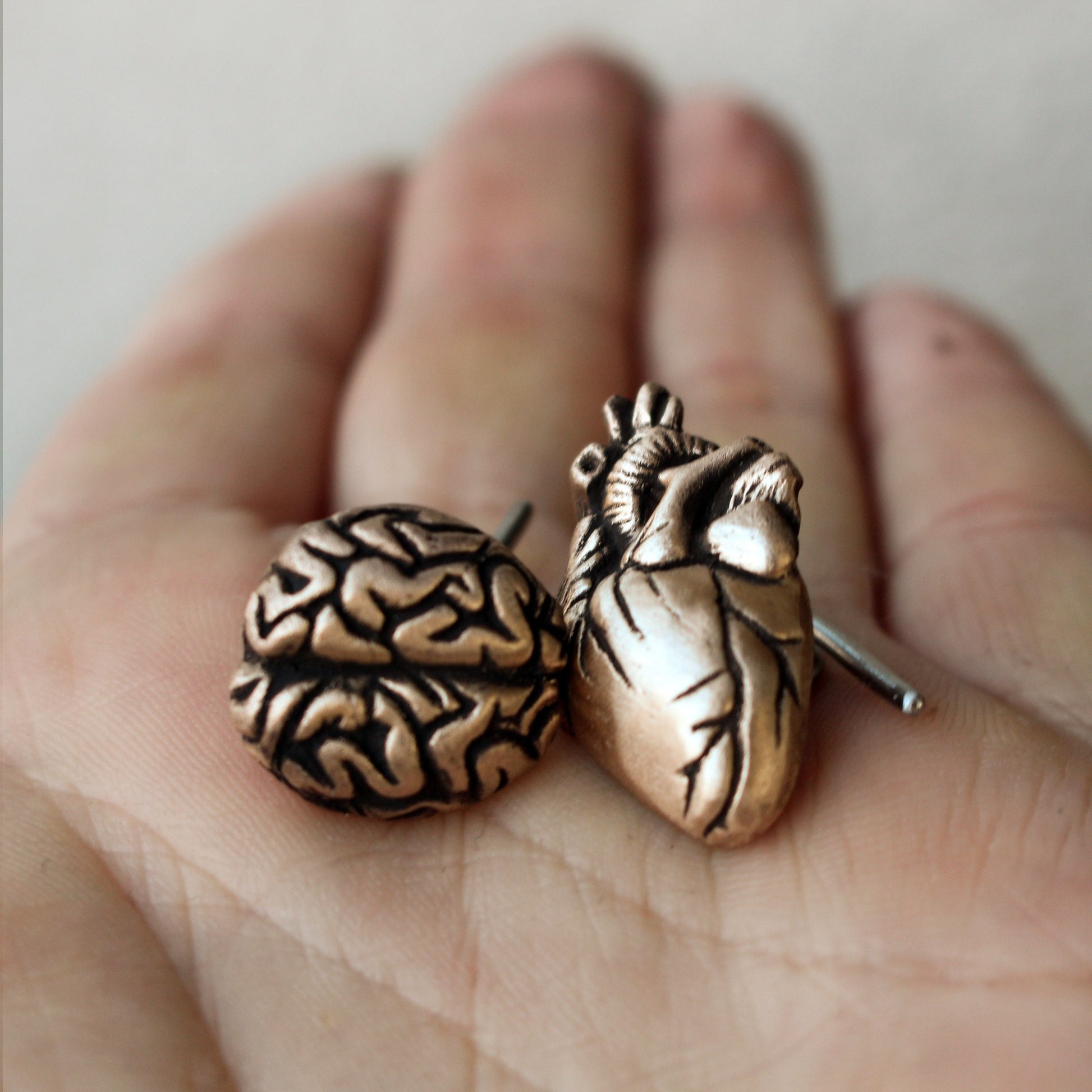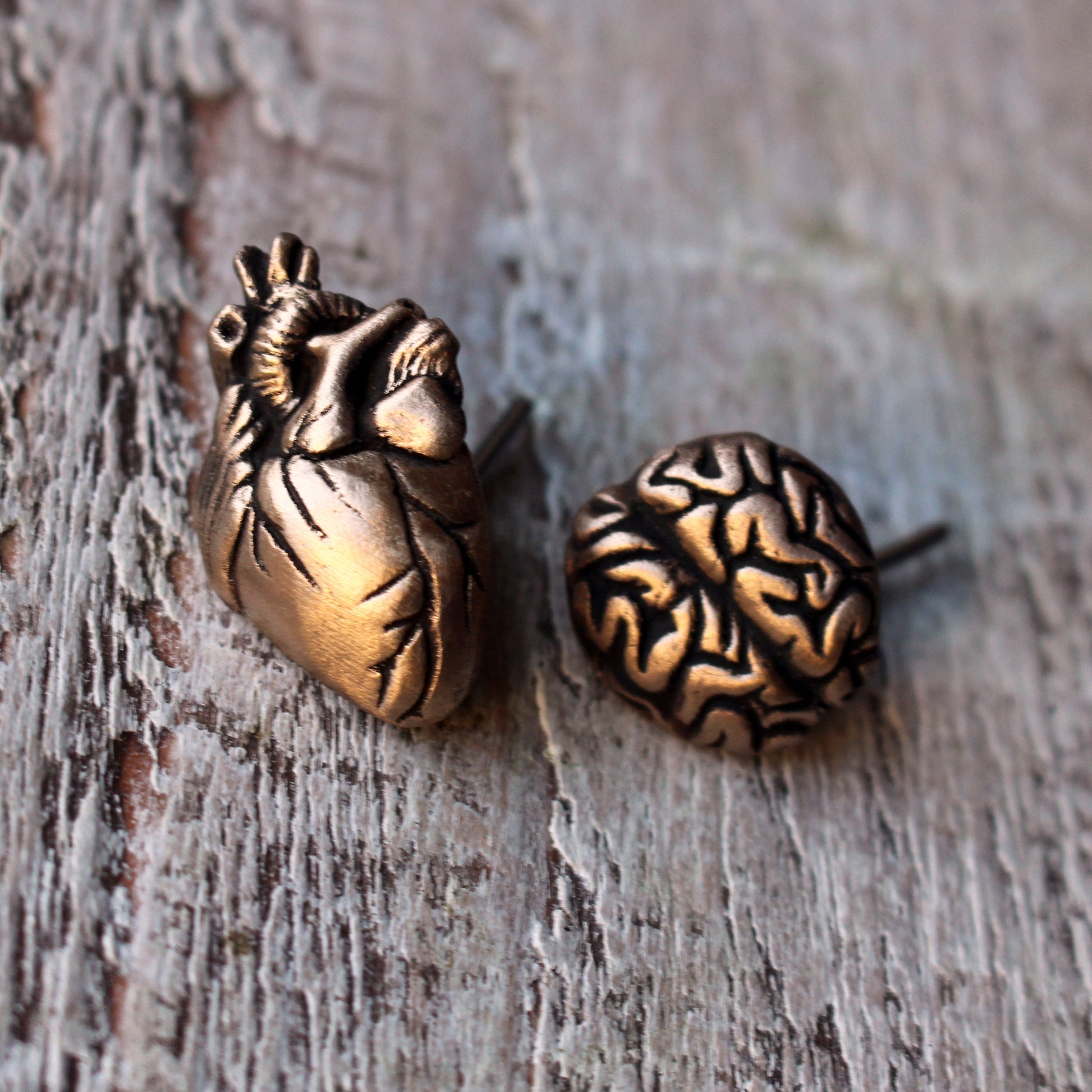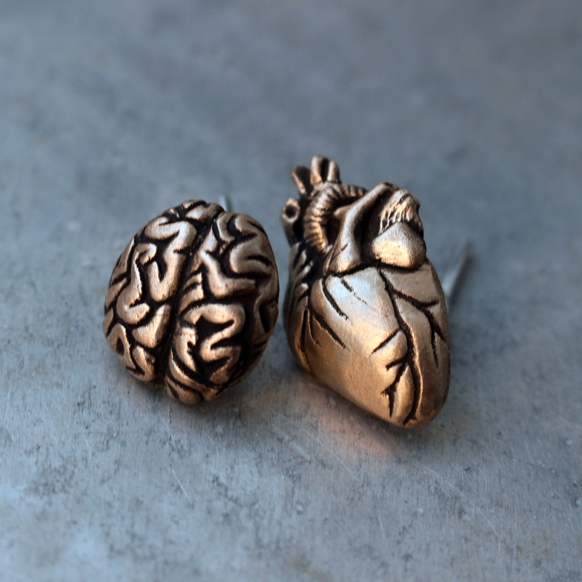 Mismatched cufflinks featuring an anatomical heart and brain, sculpted by hand in solid bronze. They are oxidized to enhance details, polished, and coated with durable jeweler’s lacquer. The hooks are made of stainless steel.