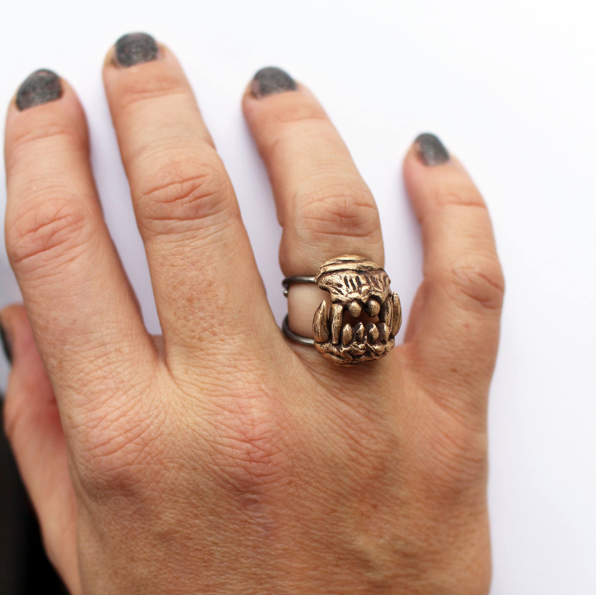 I sculpted the skeletal parts from bronze, with ring bands of surgical steel embedded inside the bronze. The rings are adjustable, though you may need pliers for major adjustments. Let me know your ring sizes for where you want to wear them, and I’ll adjust them for you.