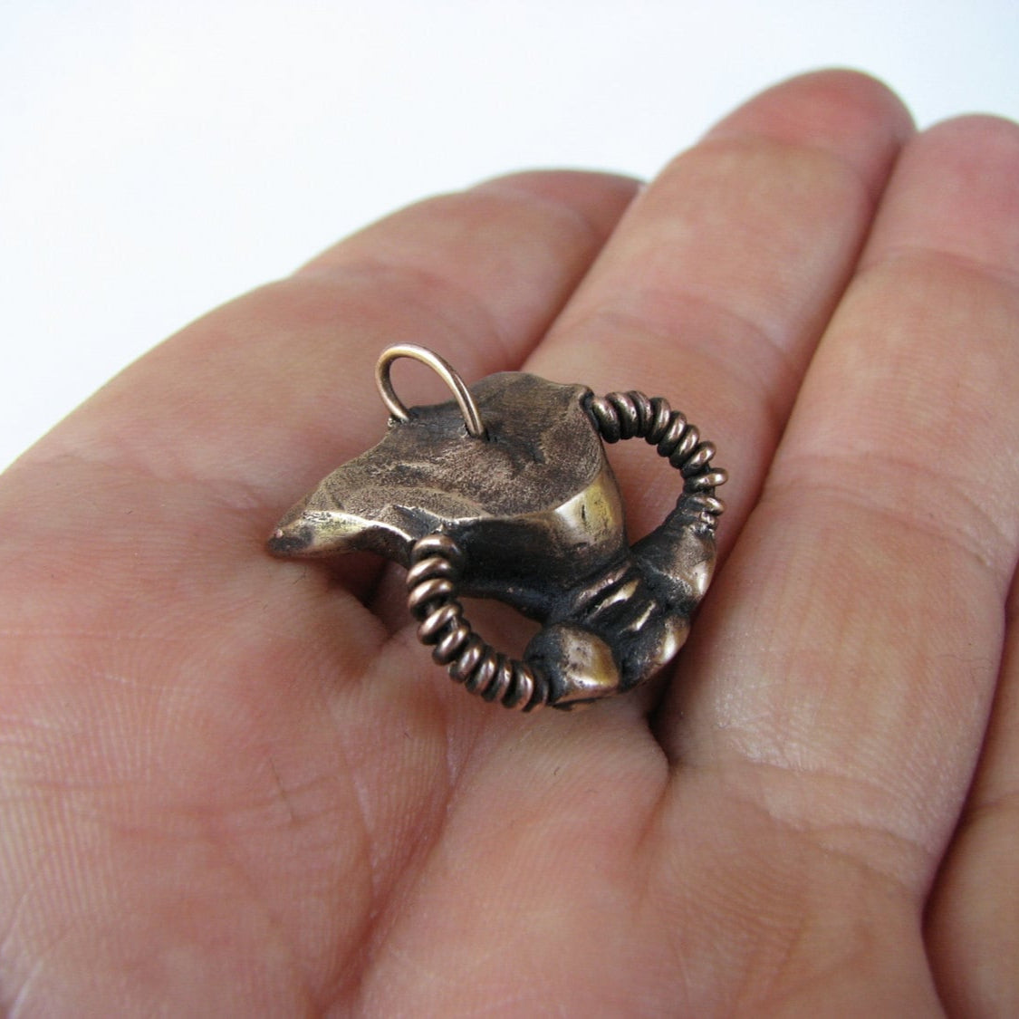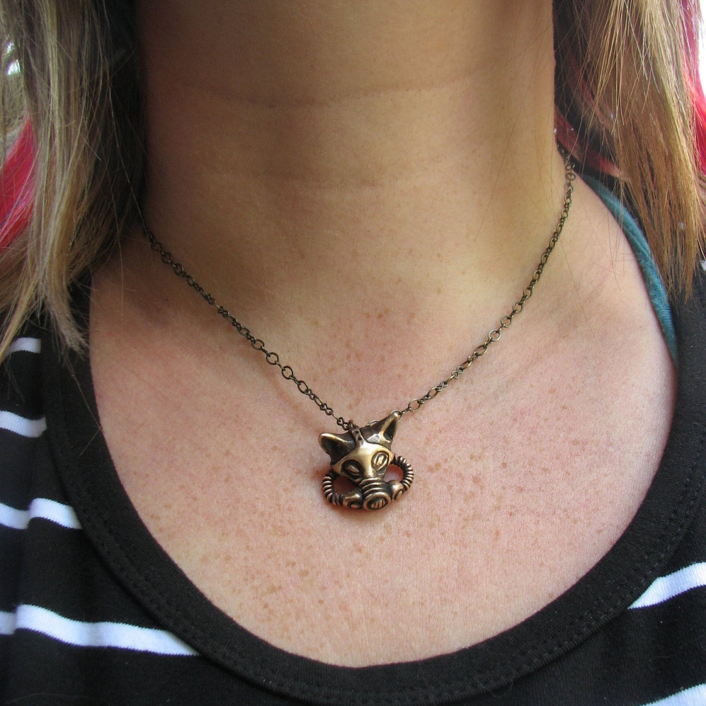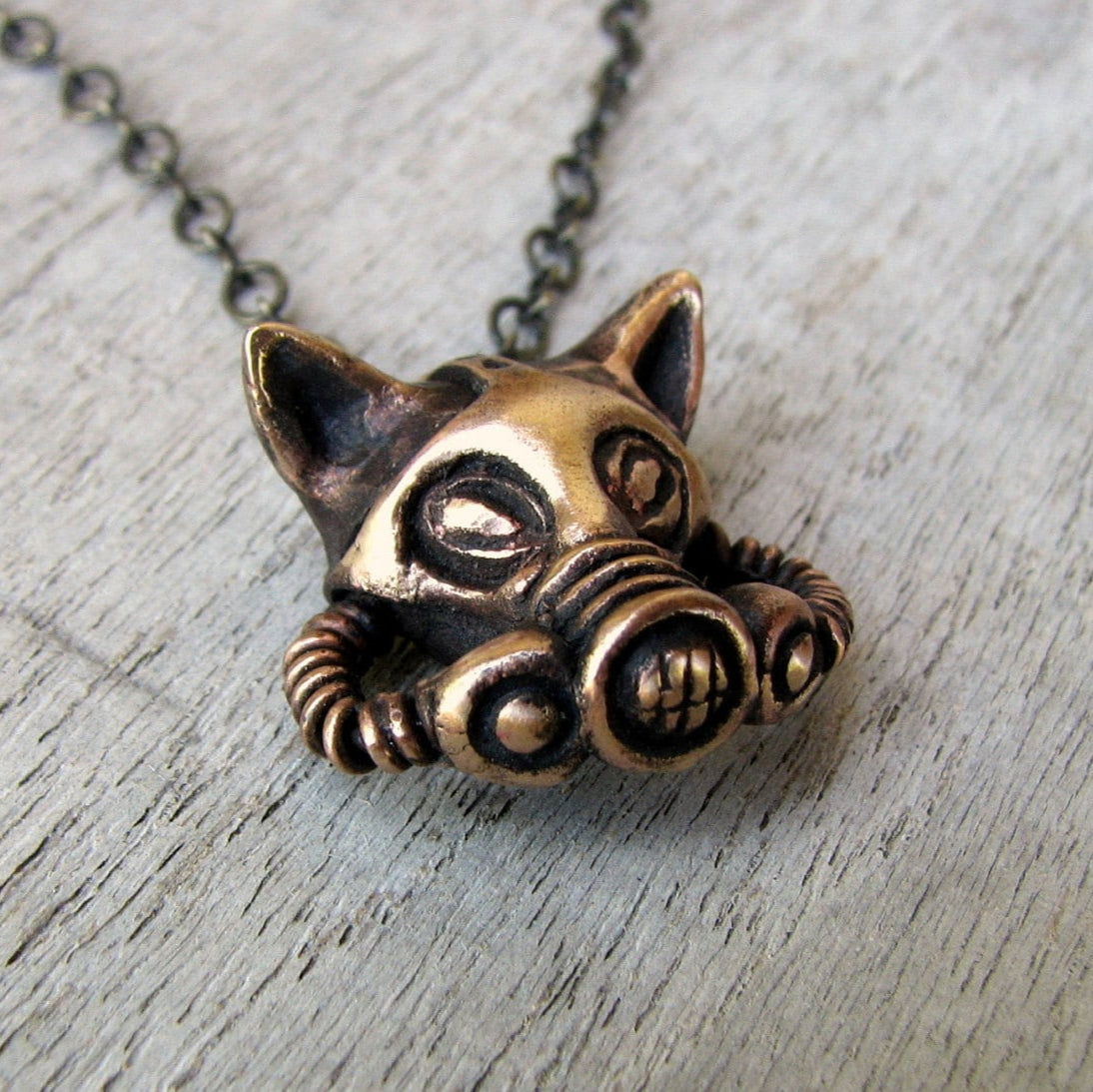Cute and strange little kitty in a gas mask pendant. I made it with bronze clay that turns to solid bronze when fired in high temperature in an oxygen free environment. I made it by combinig bronze clay and bronze wire.