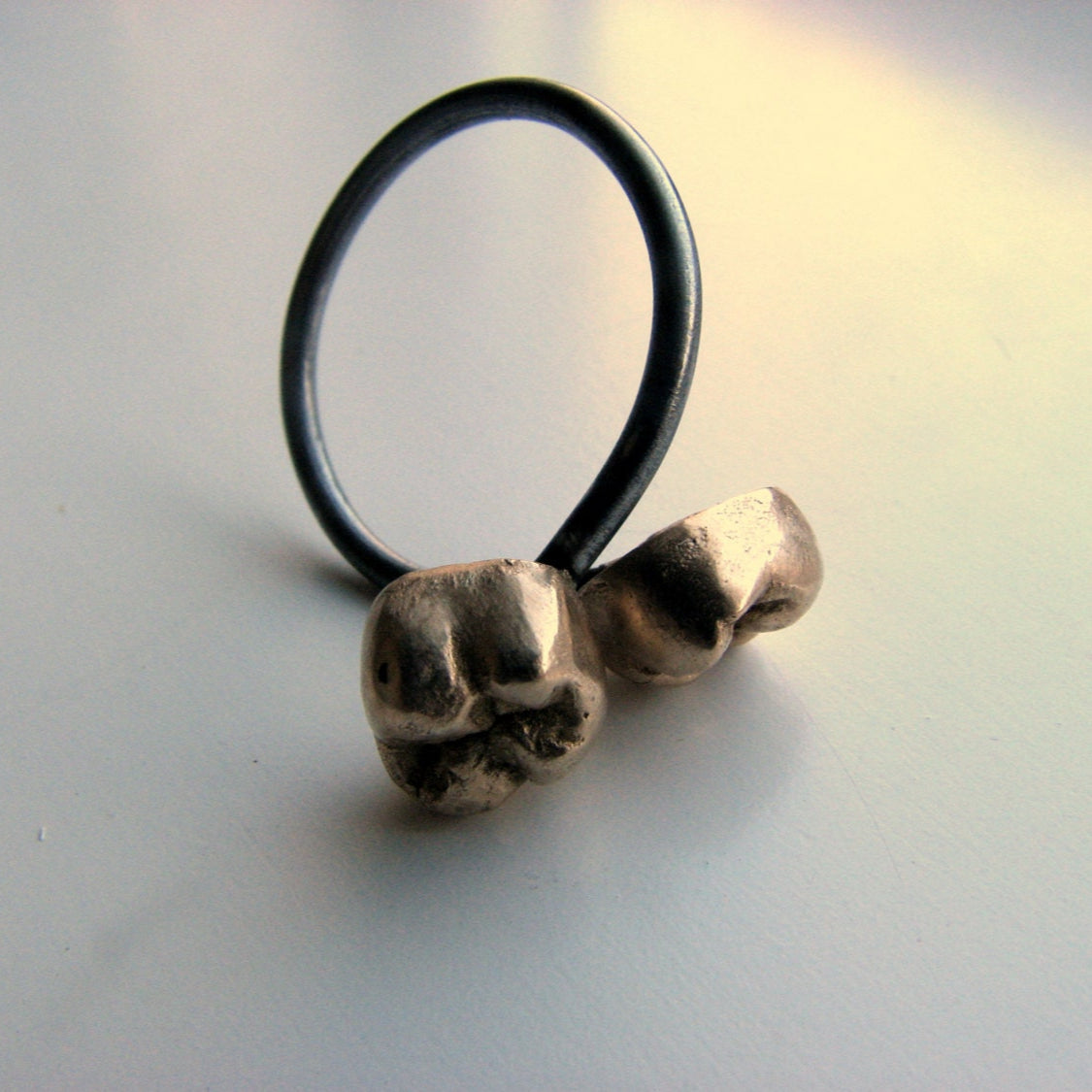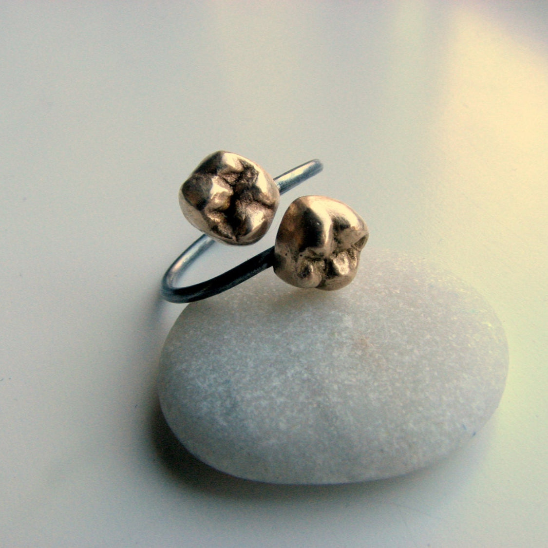 A minimalistic yet striking ring. Its sleek band and golden teeth, attached without a visible mount, give it a unique edge. Made from bronze and steel—both strong and durable metals—this ring is built to last.