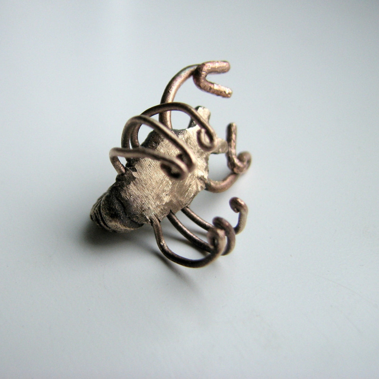 A handcrafted scorpio bug ear cuff. The scorpio is sculpted from bronze, the front legs move a bit and the other legs adjust to grip around the ear. Handmade in bronze by me. No piercing needed.