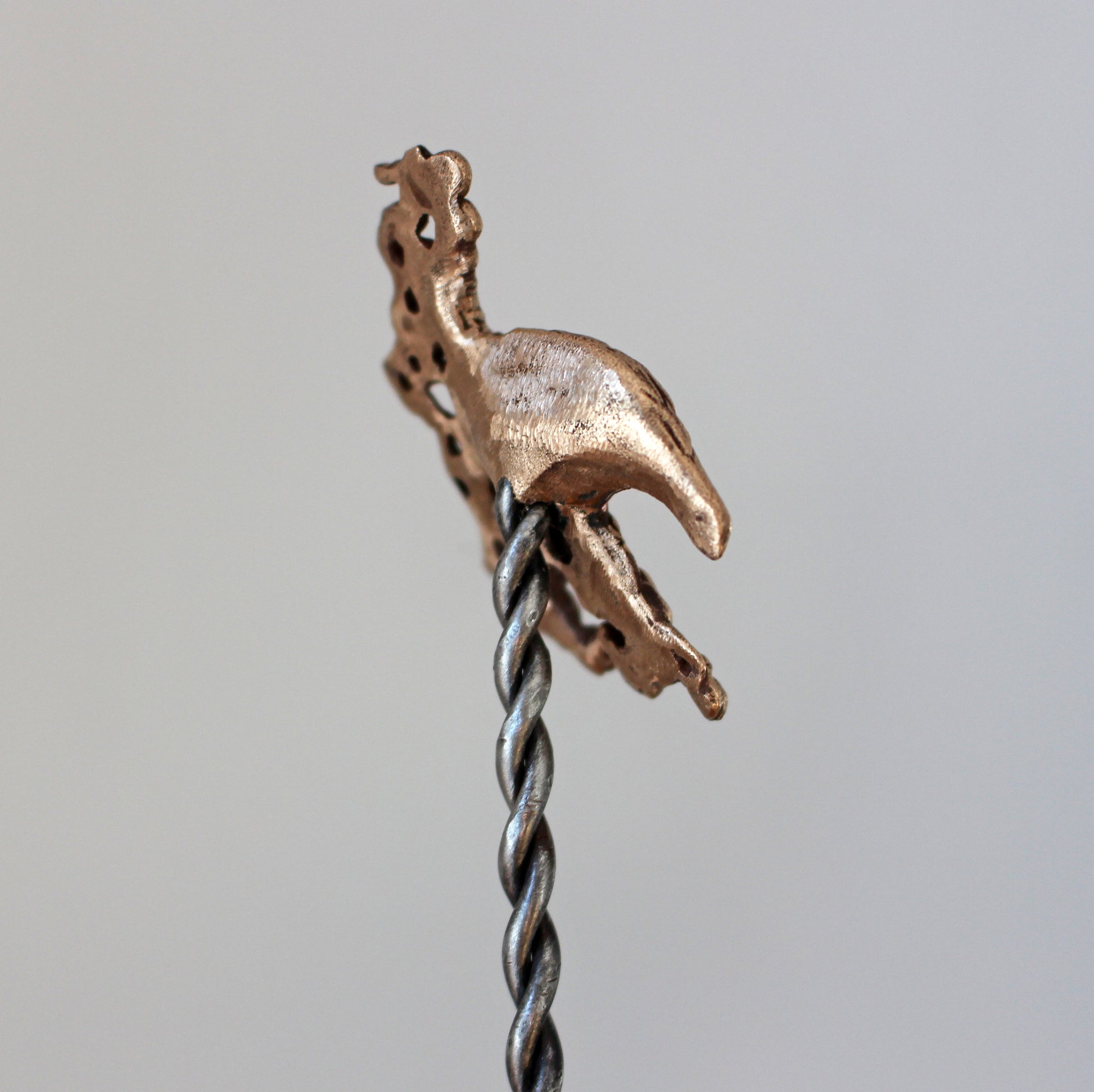 This surreal animal figure is sculpted from bronze, while the stick is forged from stainless steel. The twisted steel is shaped into a hook and embedded inside the bronze during casting, making it extremely durable. The bronze is protected with jeweler’s lacquer. I can customize the stick length to your preference.