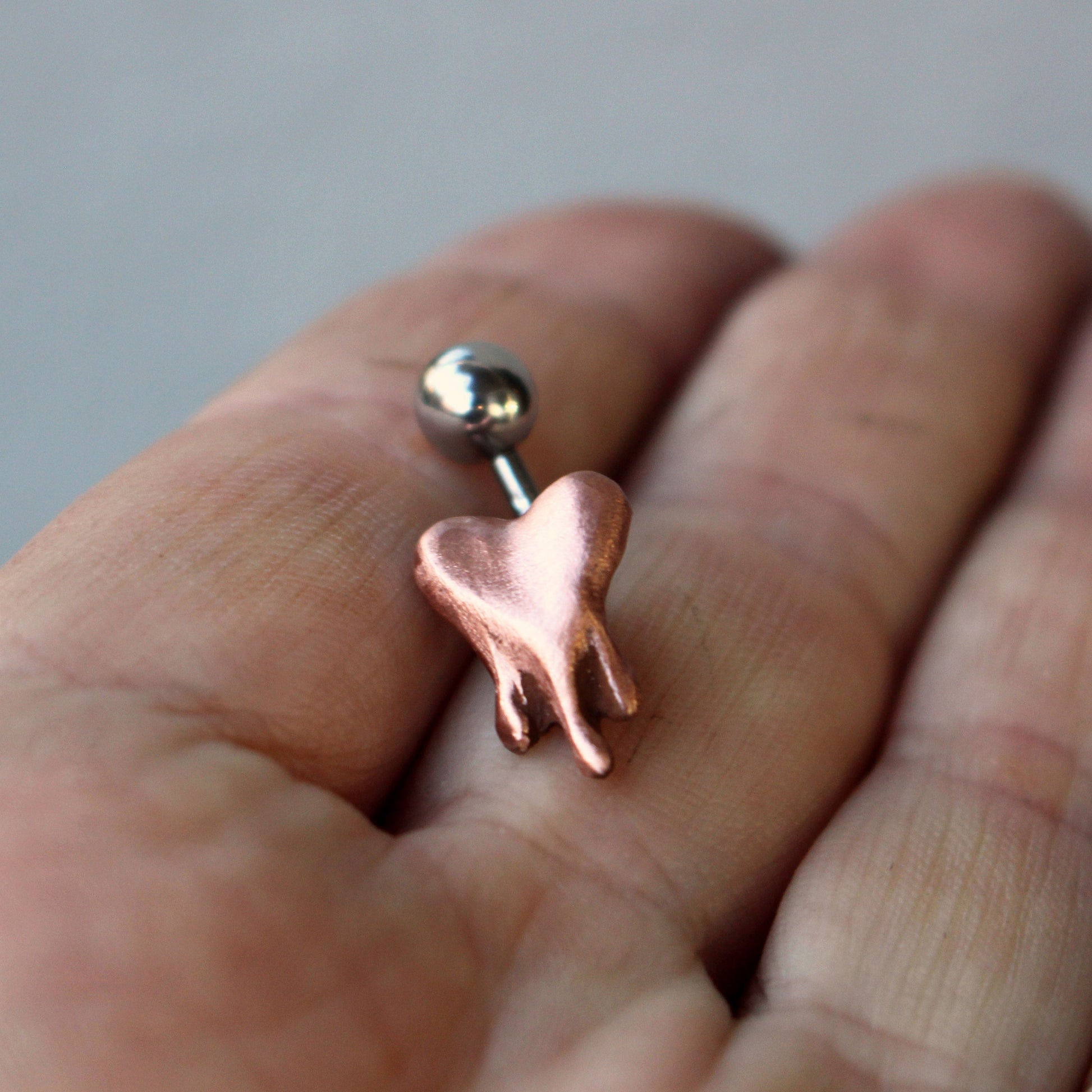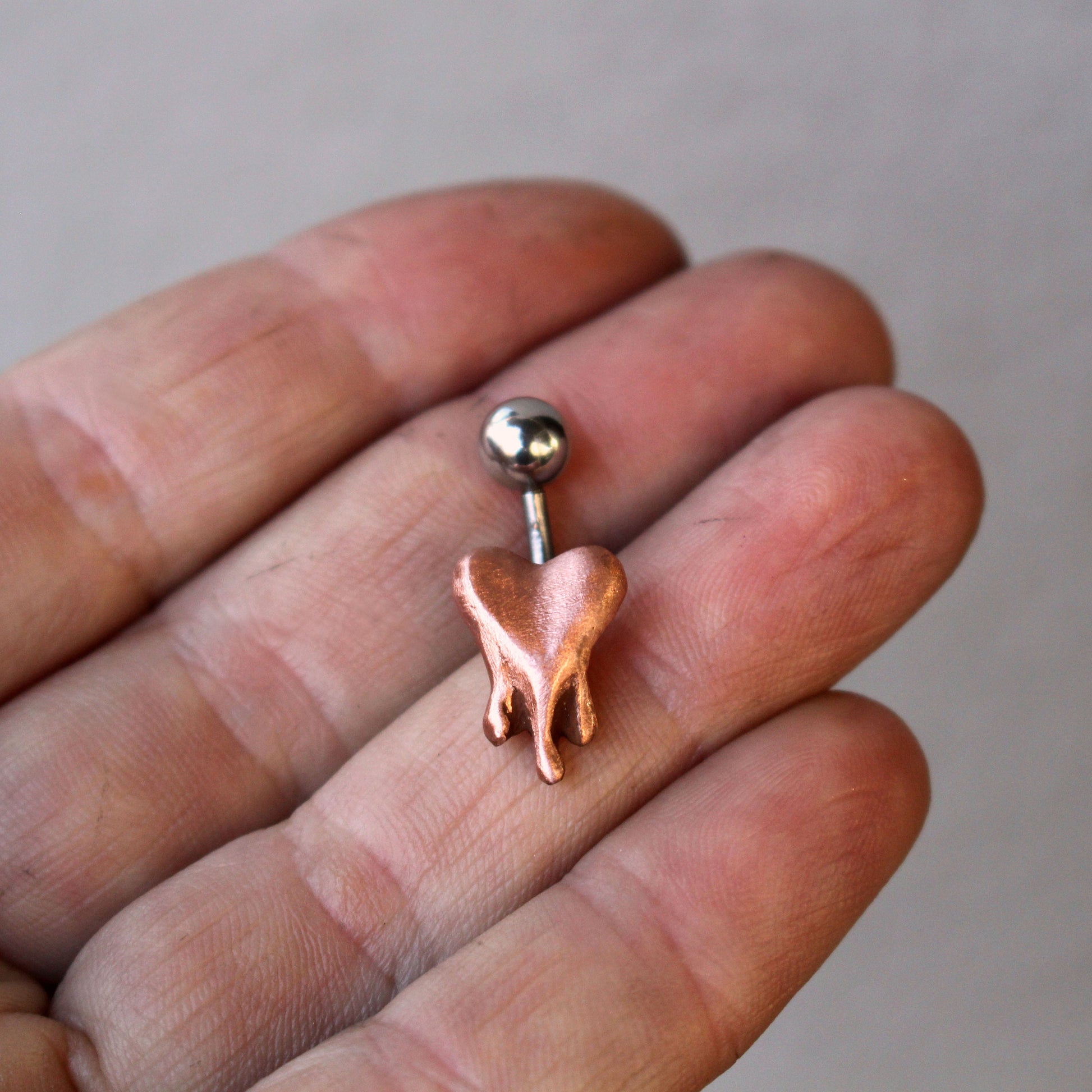 Blödande hjärta piercingsmycke. Jag har skulpterat denna unika design i rosa koppar. En 1.6 mm böjd stav är inbäddad kopparen vid gjutningen, vilket gör smycket både hållbart och stabilt. Som standard gör jag staven cirka 1 cm lång, exklusive böjen. Vill du ha en annan längd? Meddela mig vid beställning.
