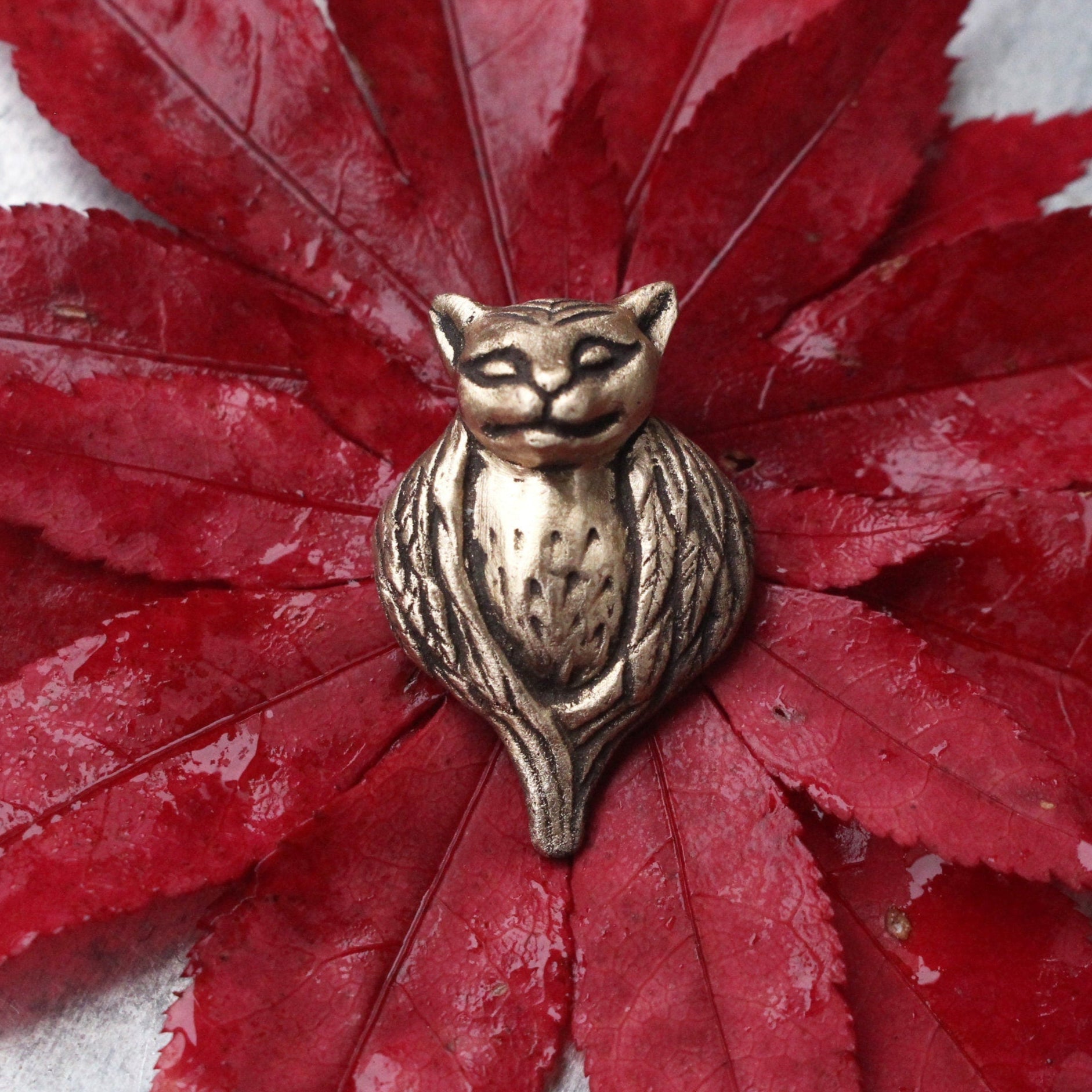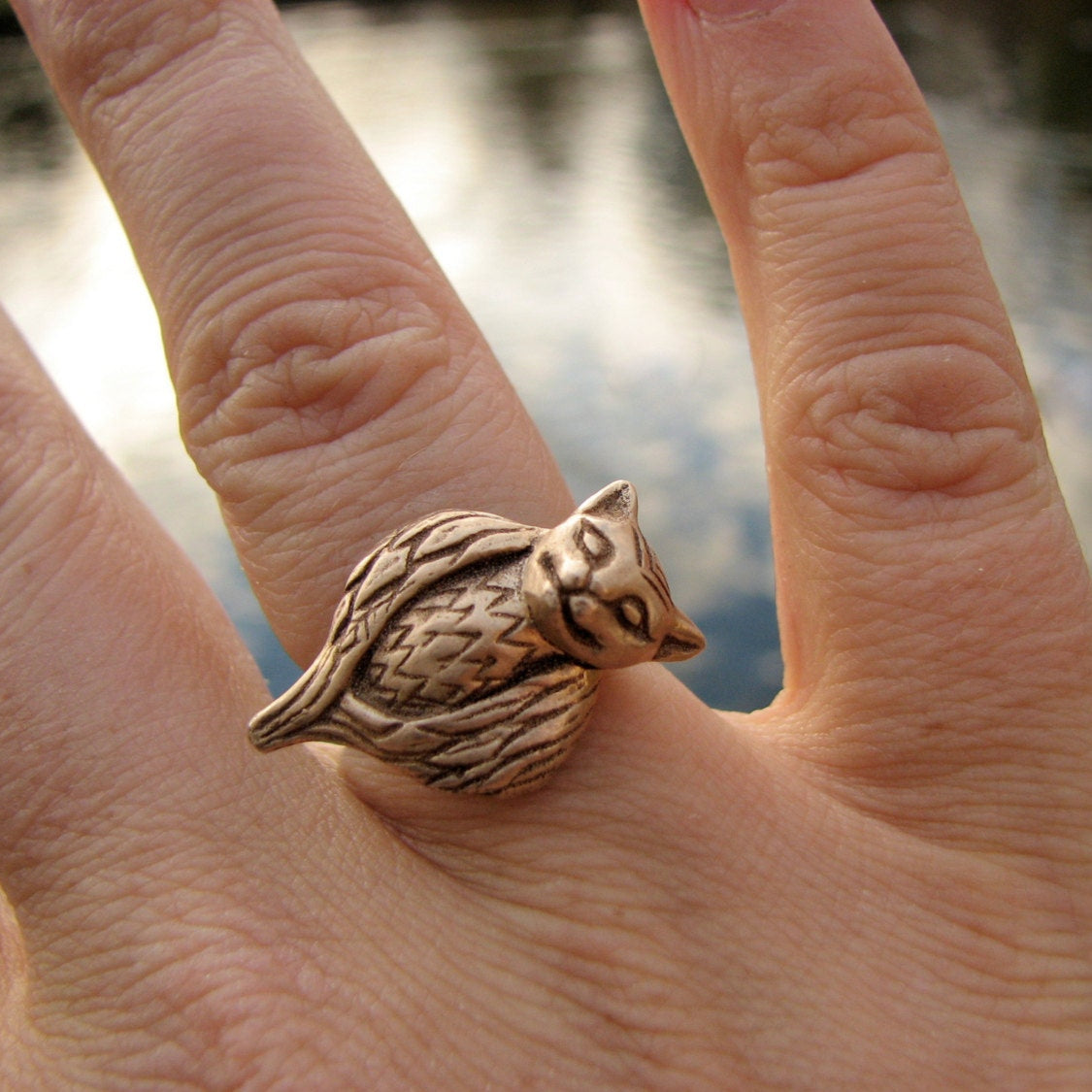 Kattuggla i brons, det är väl så här de ser ut? Jag gör denna som ring, som brosch och som halsband. Som ring är den justerbar, och har en ringskena i rostfritt stål som är ingjuten i baksidan av kattugglan. Som brosch har den en nål av rostfritt stål ingjuten i baksidan. Som halsband levereras den med en justerbar mässingskedja (max 50 eller max 80 cm).