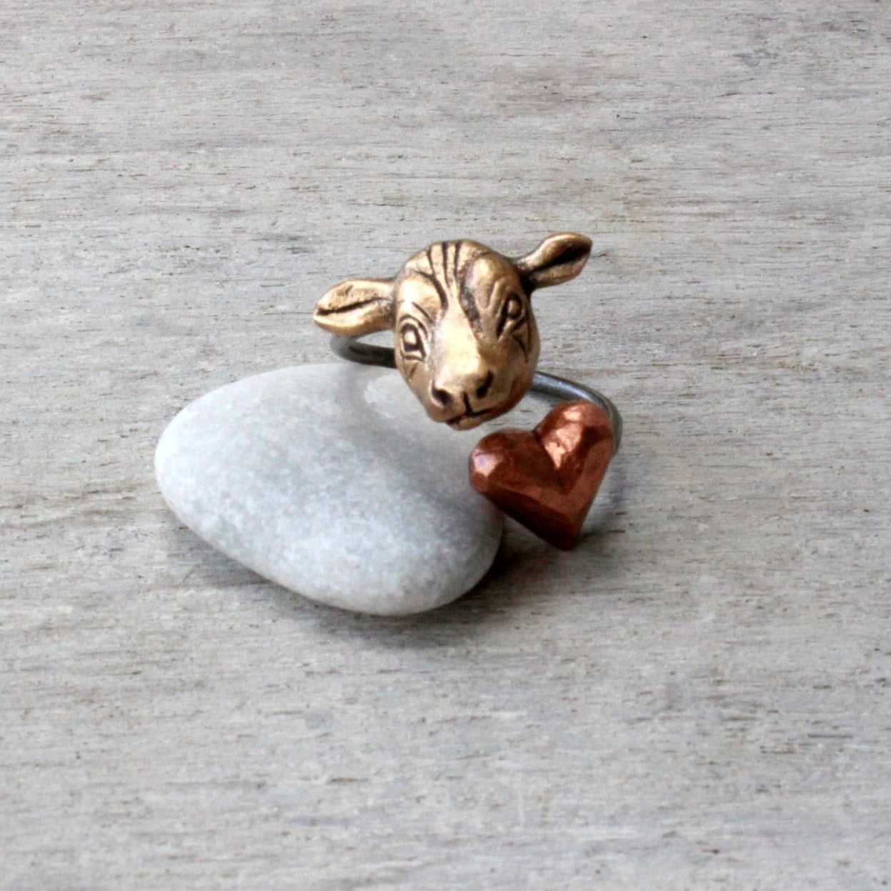 En härlig ring med ett kohuvud i ena änden och ett rosa kopparhjärta i den andra. Tillverkad i brons och koppar med ett ringband av rostfritt stål ingjutet i de skulpterade detaljerna . Justerbar för att passa alla storlekar.