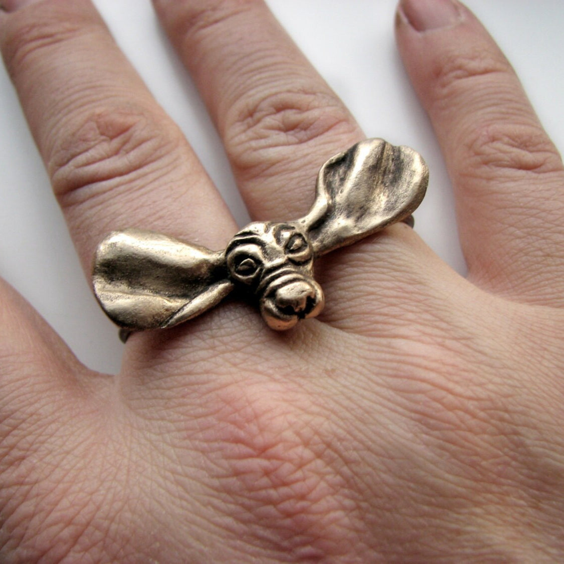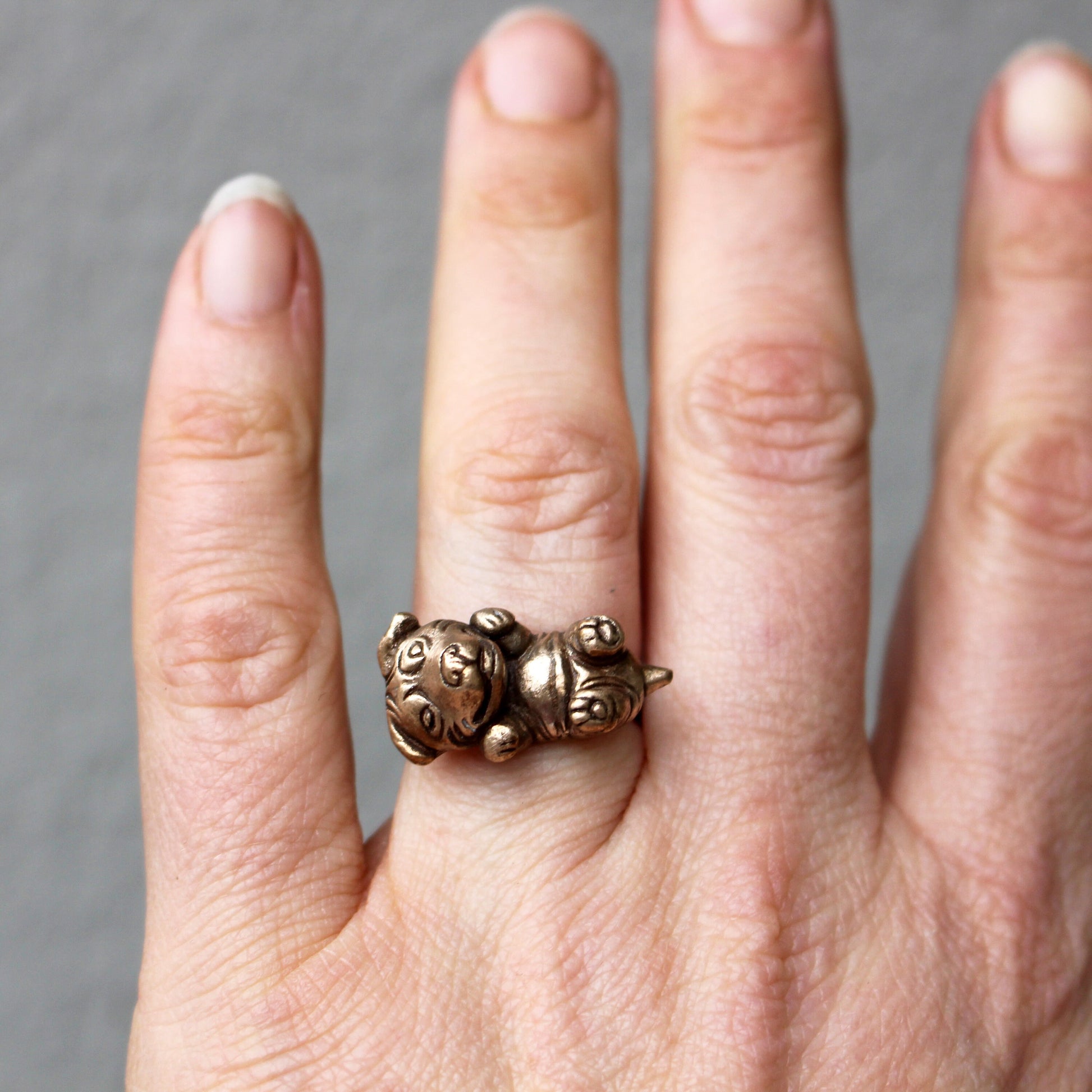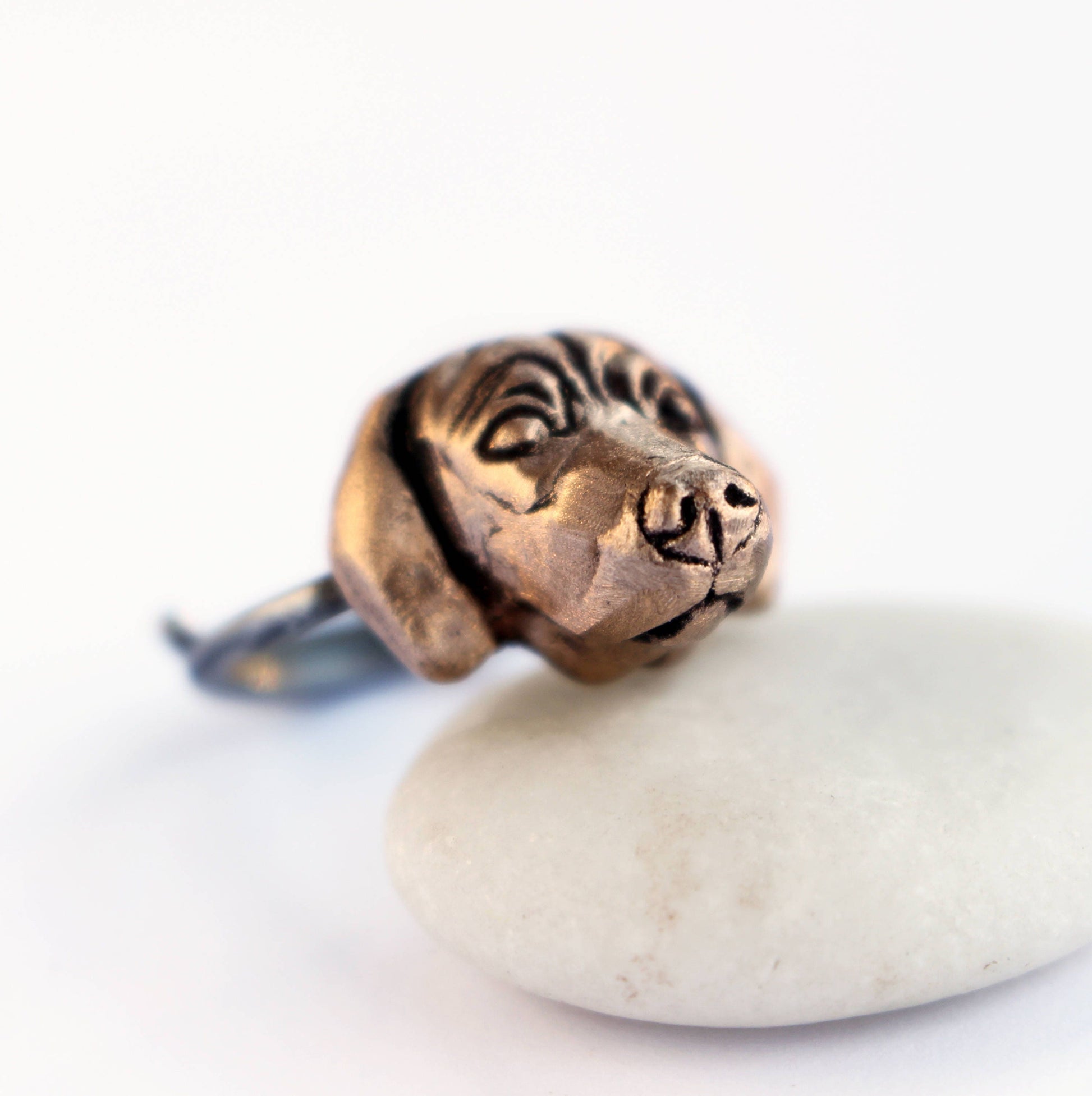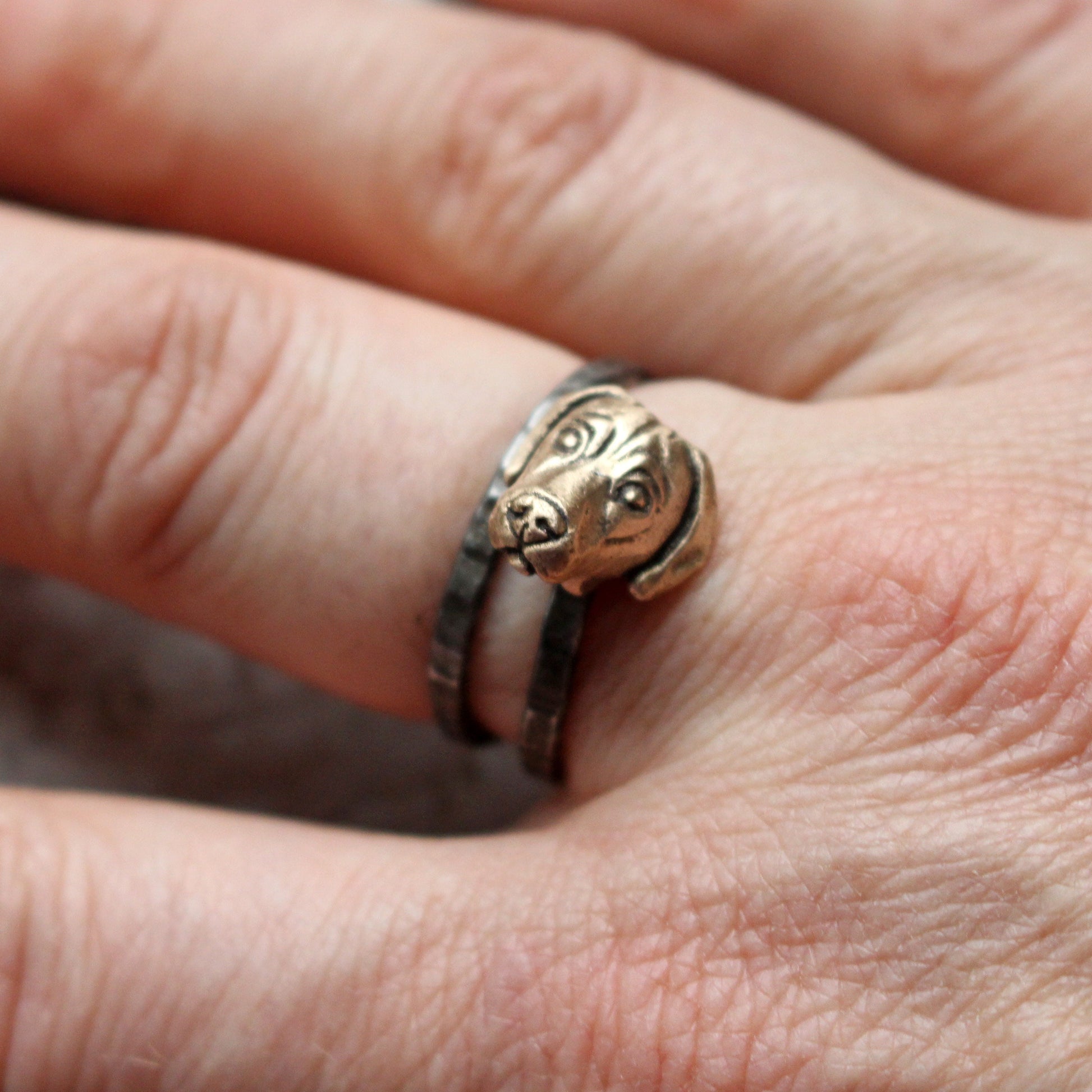 Vill du bära med dig din hund varje dag? Nu kan du – i form av en unik, handgjord ring! Jag skulpterar ett litet hundhuvud i brons, baserat på din hunds utseende. Ringskenan är av kirurgiskt stål och är inljuten i bronset för hållbarhet och komfort.