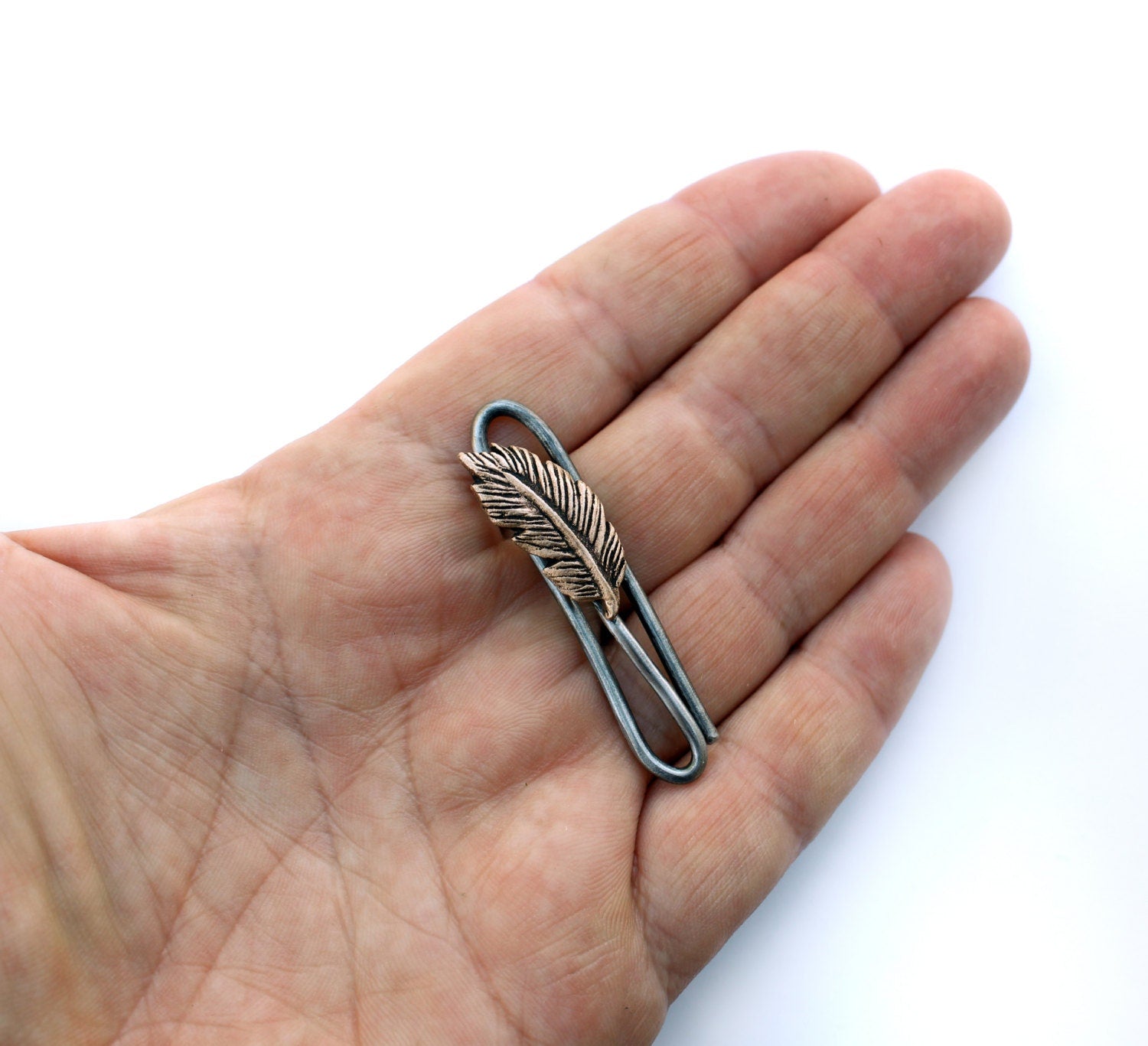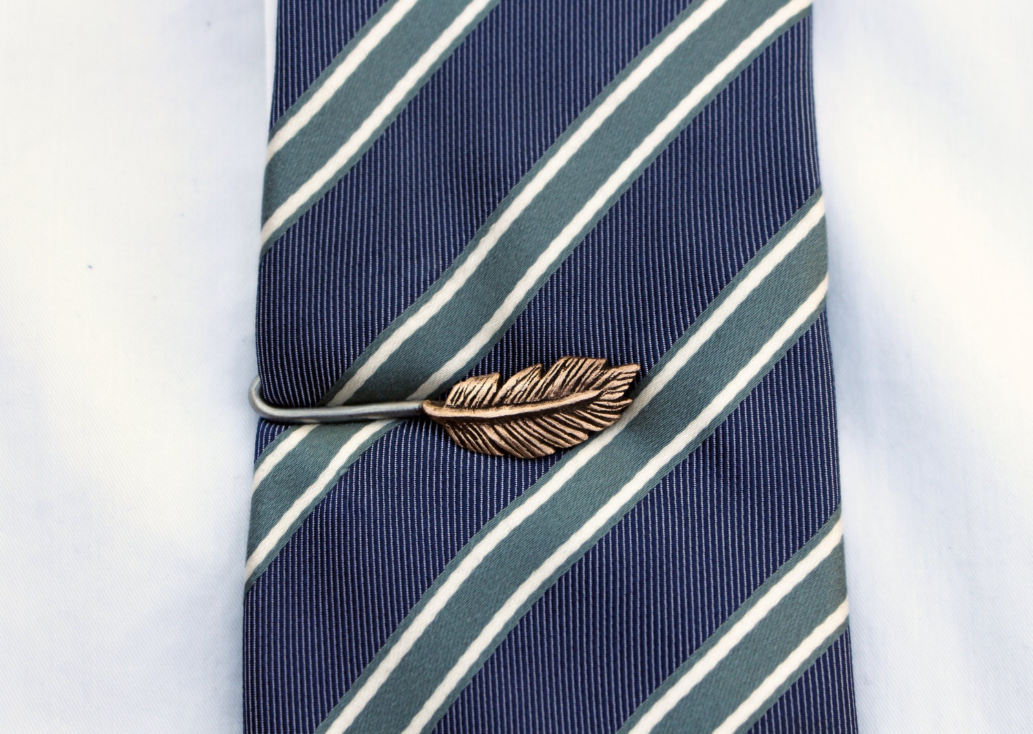 Elegant och unik slipsklämma dekorerad med en skulpterad miniatyr fjäder.