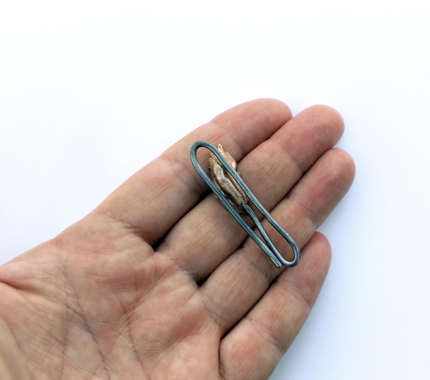 Klämman är smidd av tjock rostfri ståltråd och inbäddad i bronsfjädern vid gjutningen. Slipsnålen är cirka 5 cm lång.
