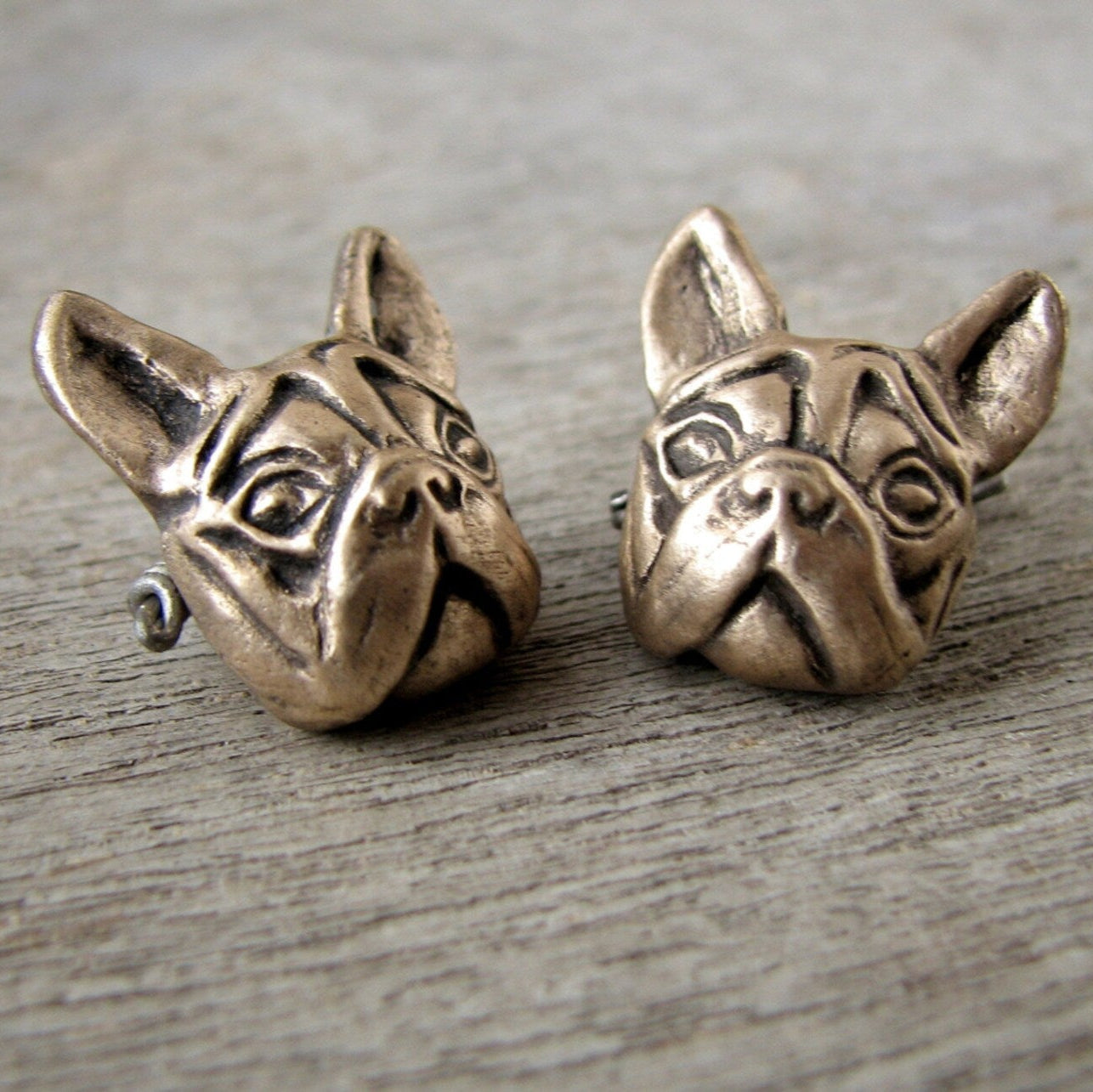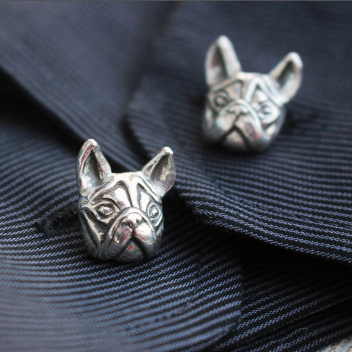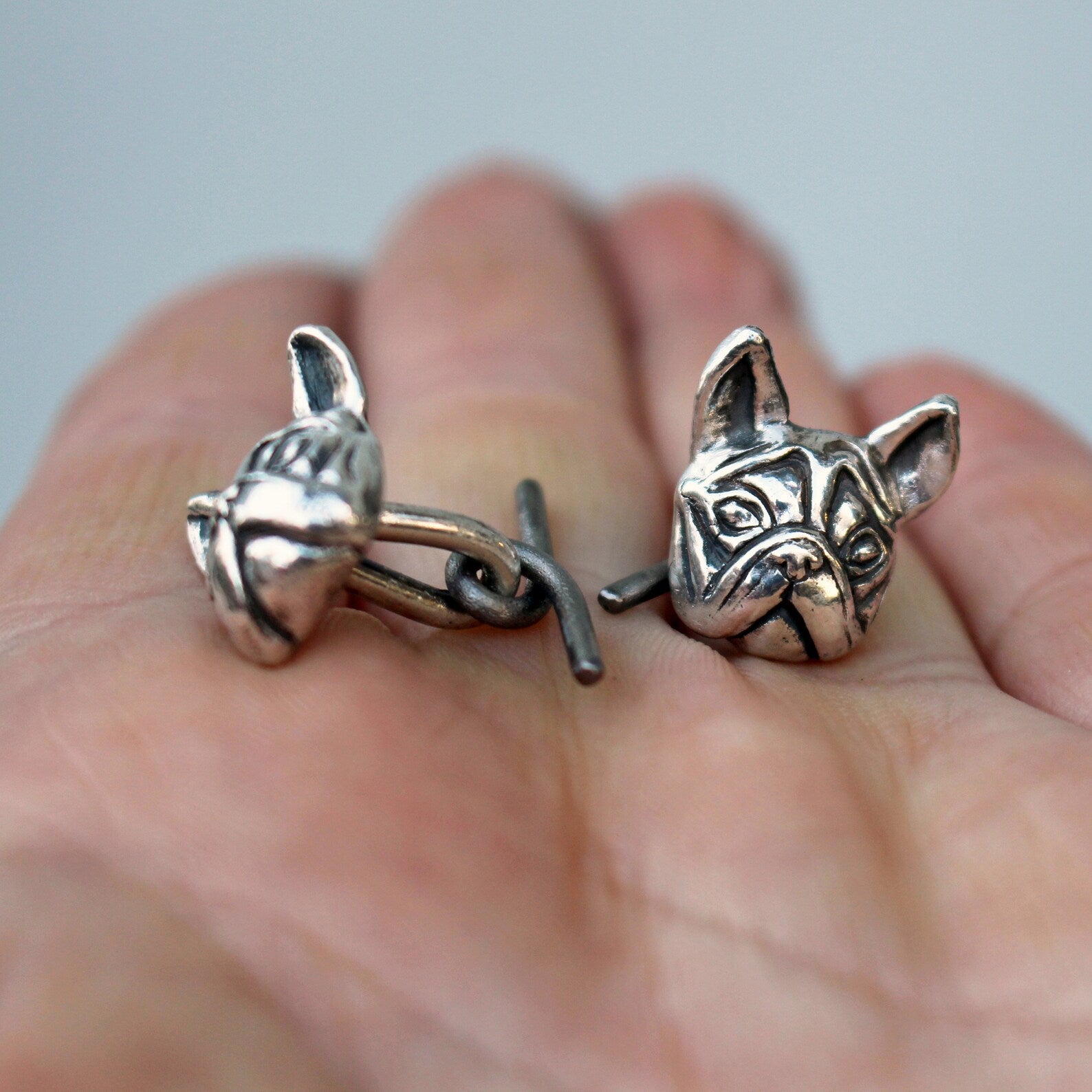 Jag tillverkar dessa manschettknappar med bulldog huvuden för hand. Du kan välja mellan brons med krokar i rostfritt stål eller silver med krokar i titan.