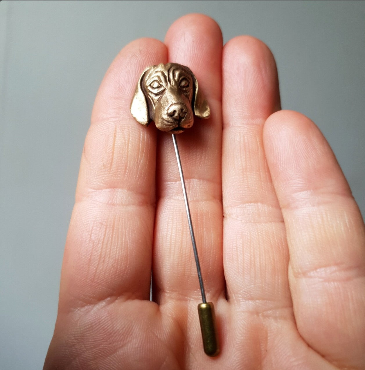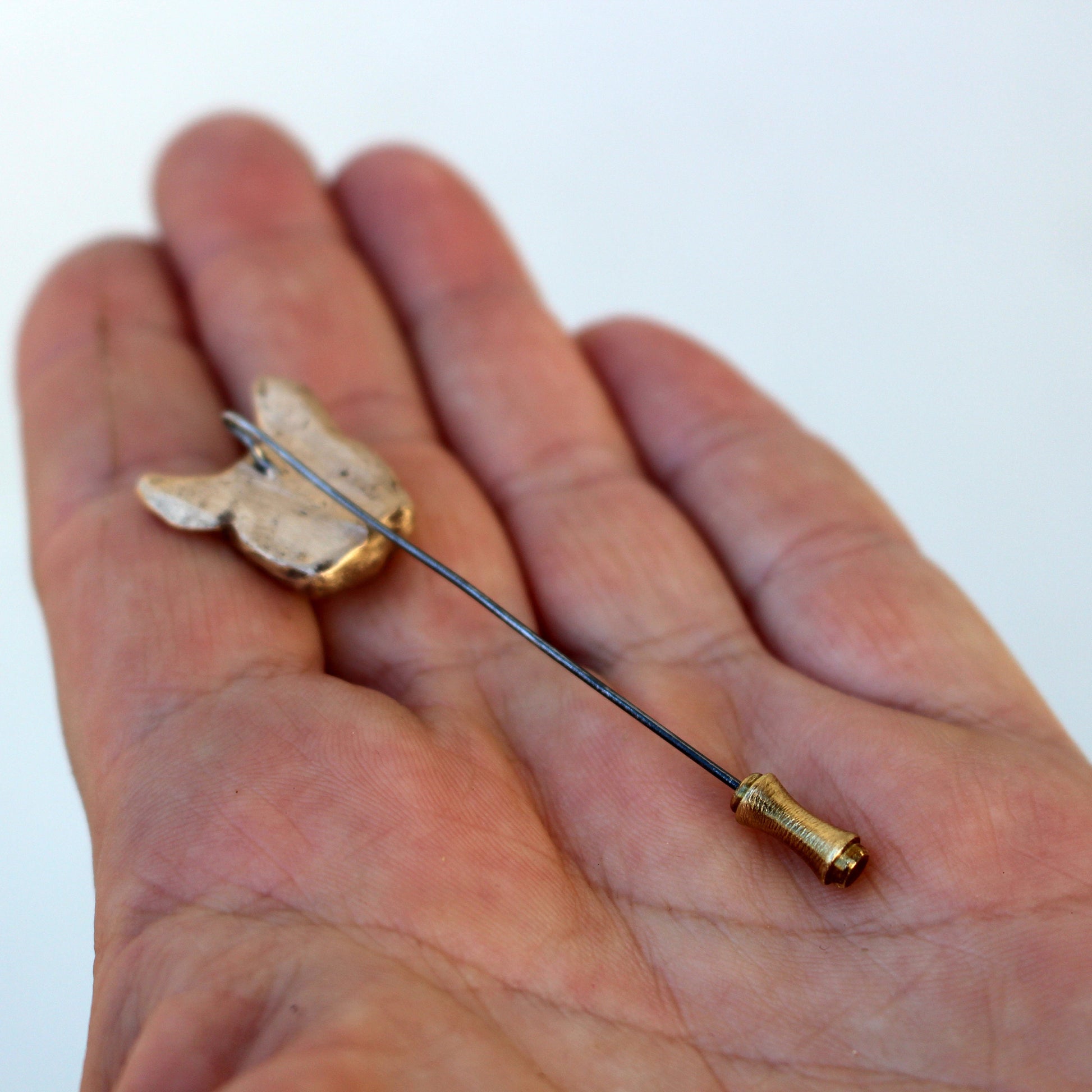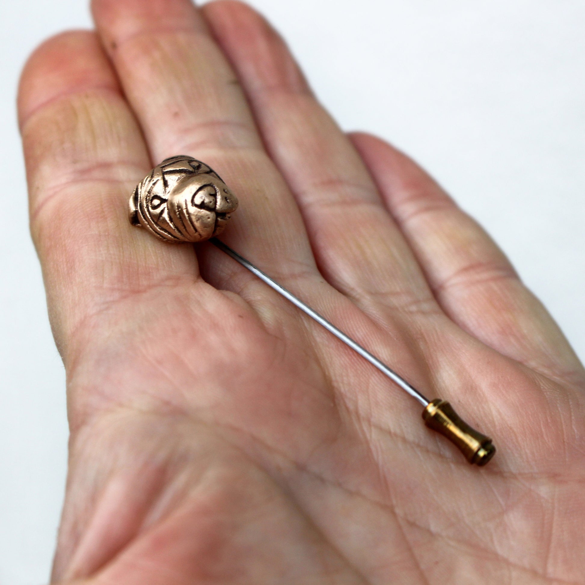 Jag skulpterar hundhuvudet för hand efter bilder på din hund och gjuter det i brons. Själva pinnen är tillverkad av rostfritt stål som jag gjuter in i bronset för en hållbar, stilren design. Standardlängden är ca 6 cm, men om du önskar en längre eller kortare variant anpassar jag den efter dina önskemål. Bronset är behandlat med en slitstark smyckeslack för att skydda mot oxidation.