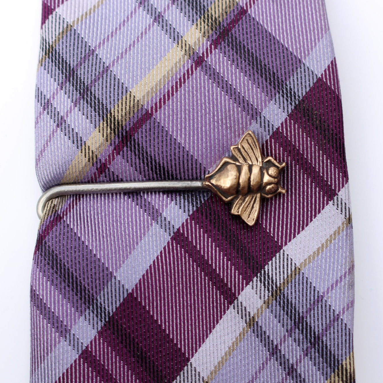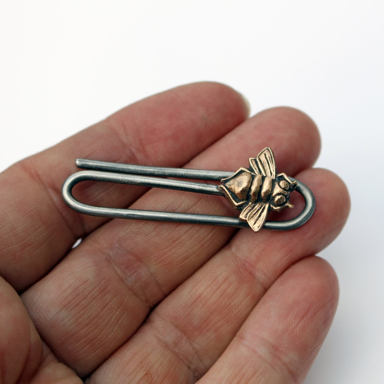 En elegant och unik slipsnål med ett honungsbi skulpterat i brons. Klämman är smidd av tjock rostfri ståltråd och inbäddad i bronsinsekten vid gjutningen för en stabil och hållbar design. Slipsnålen är cirka 5 cm lång.