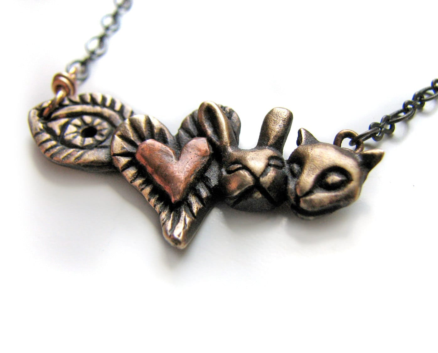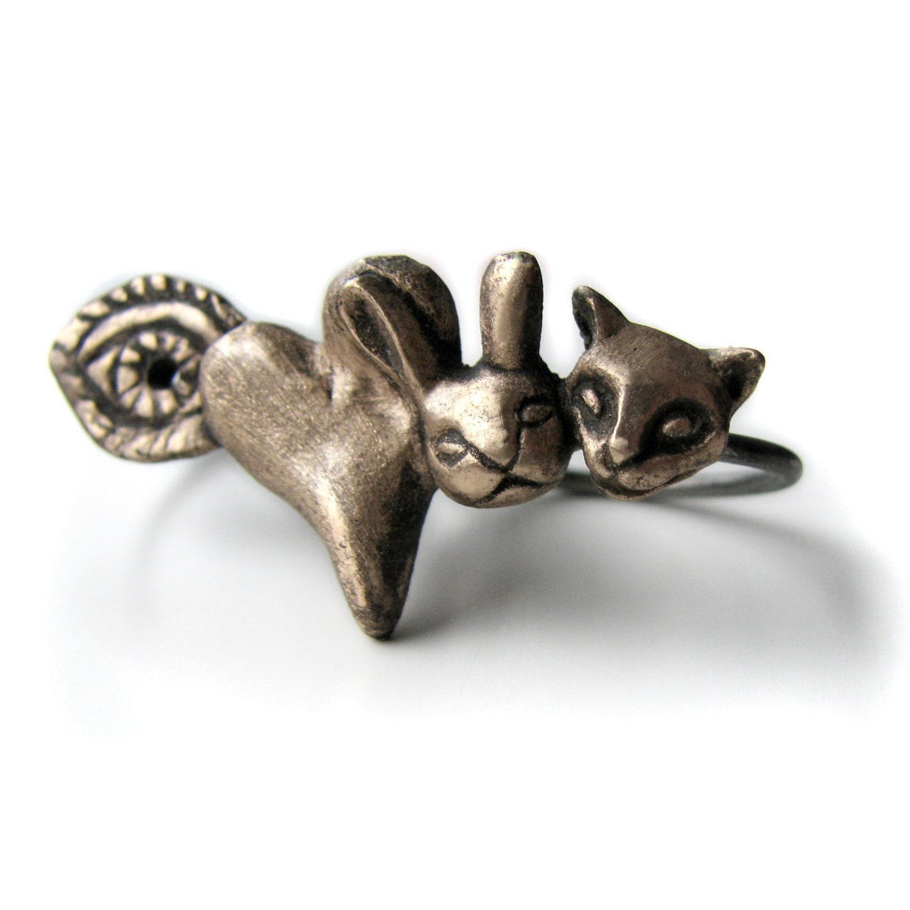 Söt rebus med ett öga, ett hjärta, en kanin och en katt. Man kan läsa den som: I love animals. Skulpterad i brons.