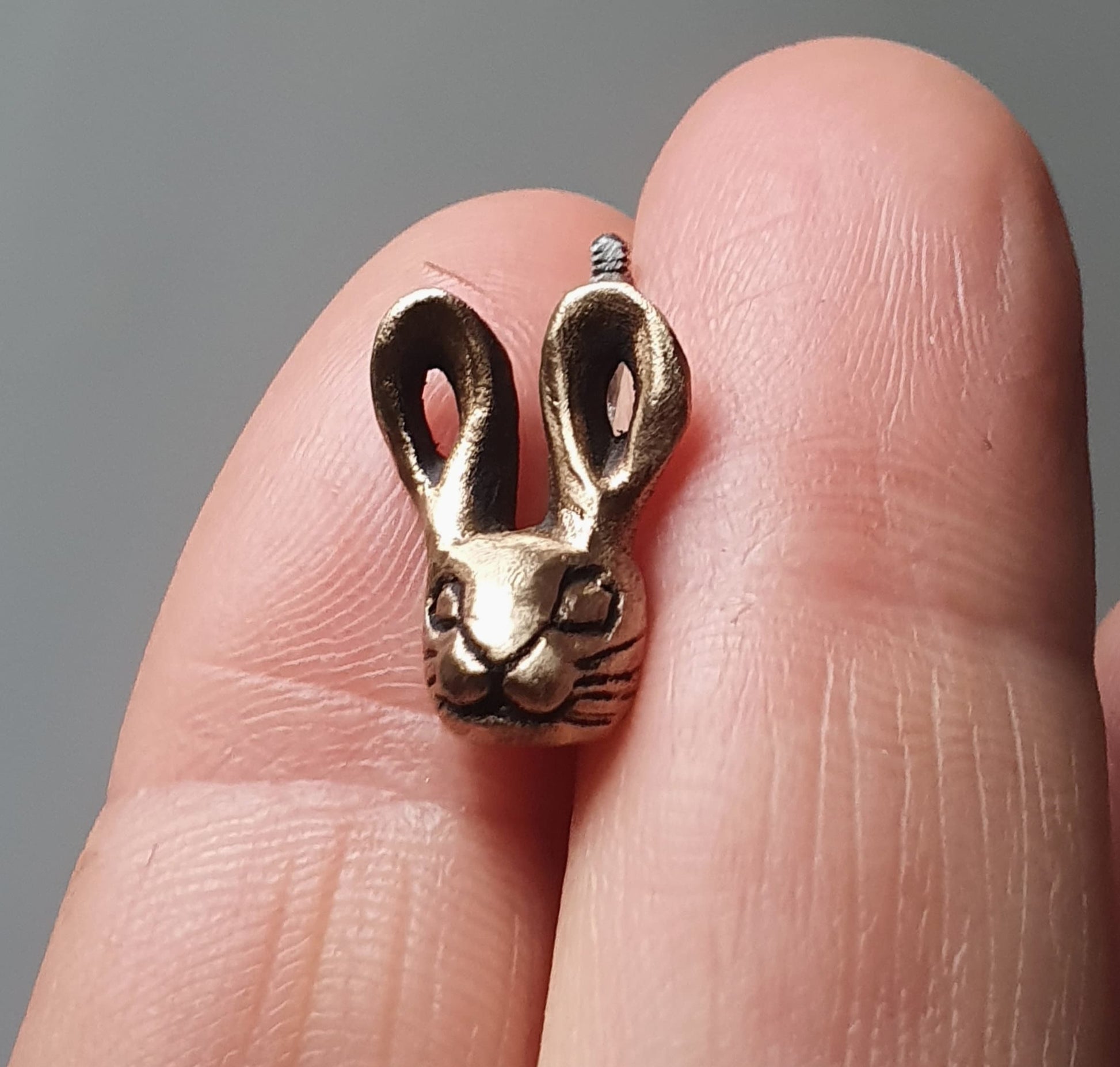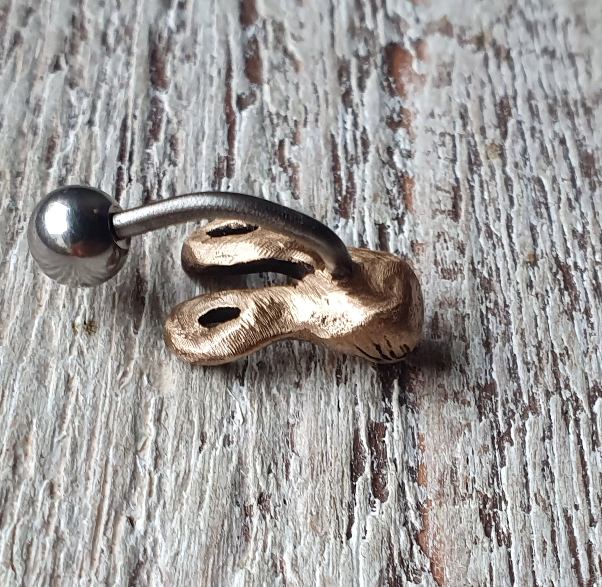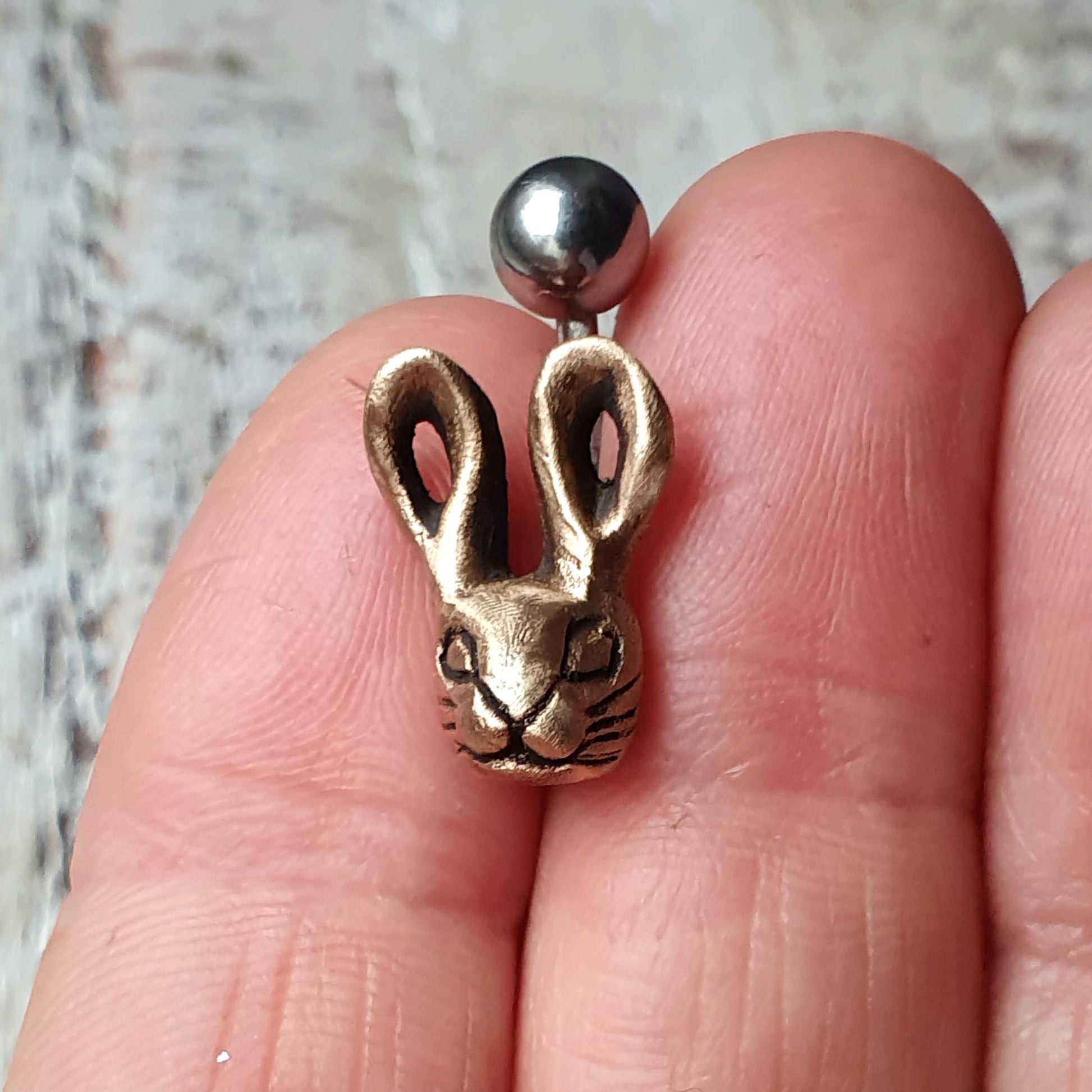 Ett navelsmycke med ett bedårande kaninhuvud i brons. En 1.6 mm tjock böjd barbell är inbäddad i bronset vid gjutningen, vilket ger en stabil och hållbar design. Som standard gör jag staven cirka 1 cm lång, exklusive böjen. Vill du ha en annan längd? Meddela mig vid beställning.