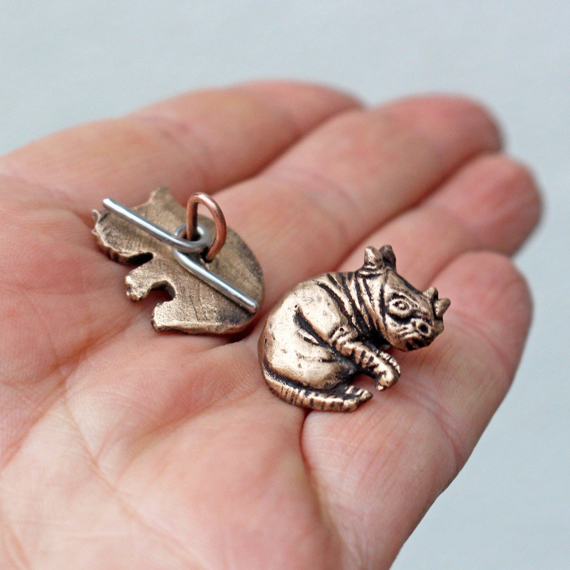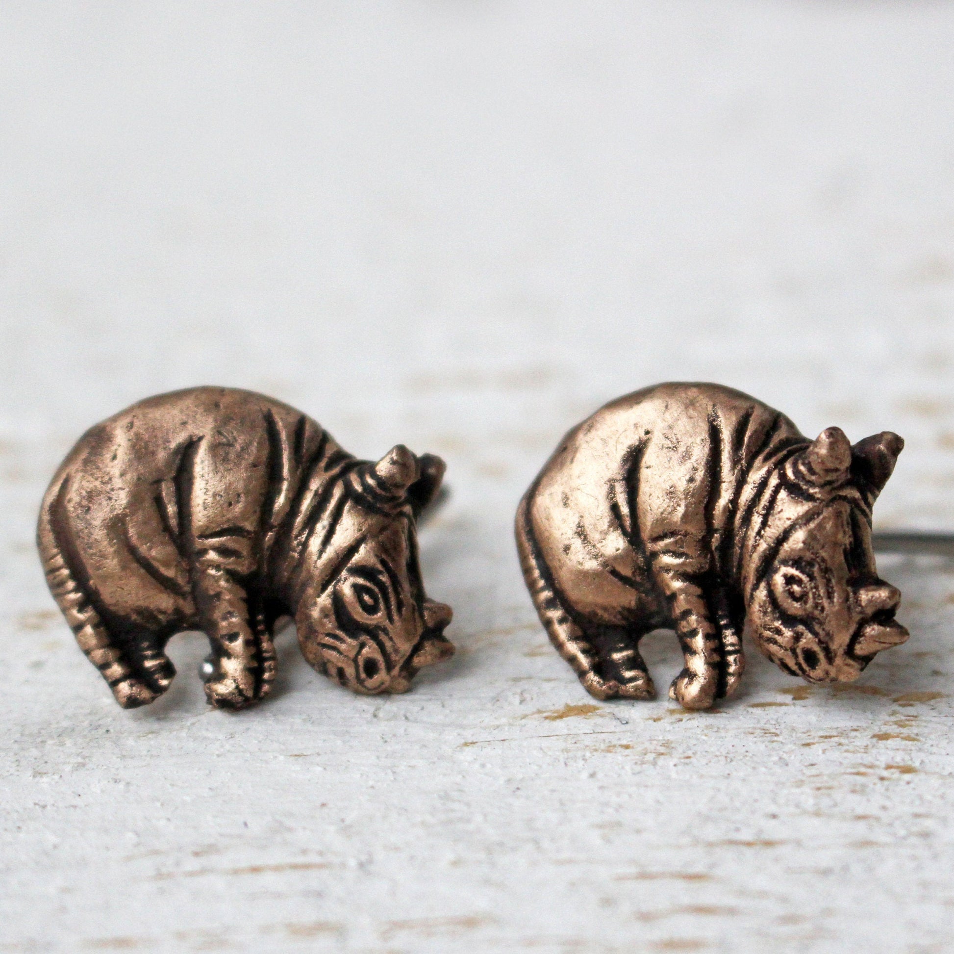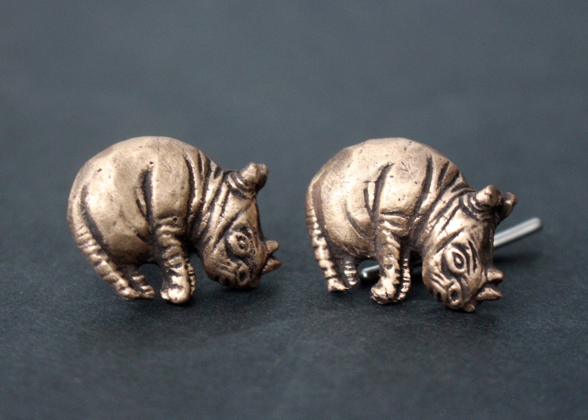 Handgjorda noshörningsmanschettknappar. Miniatyr noshörningarna är skulpterade i brons och har krokar av kirurgiskt stål.