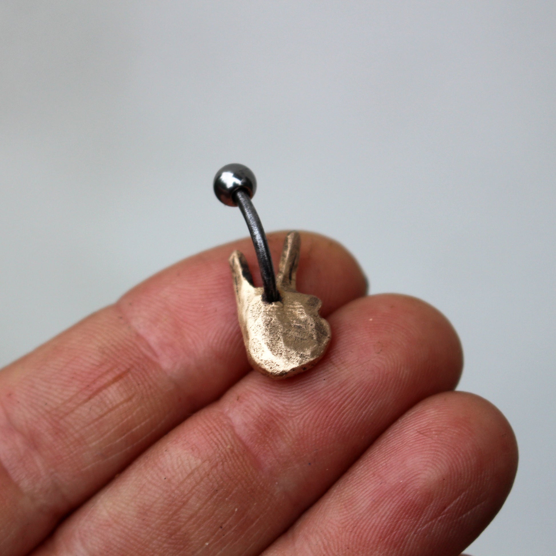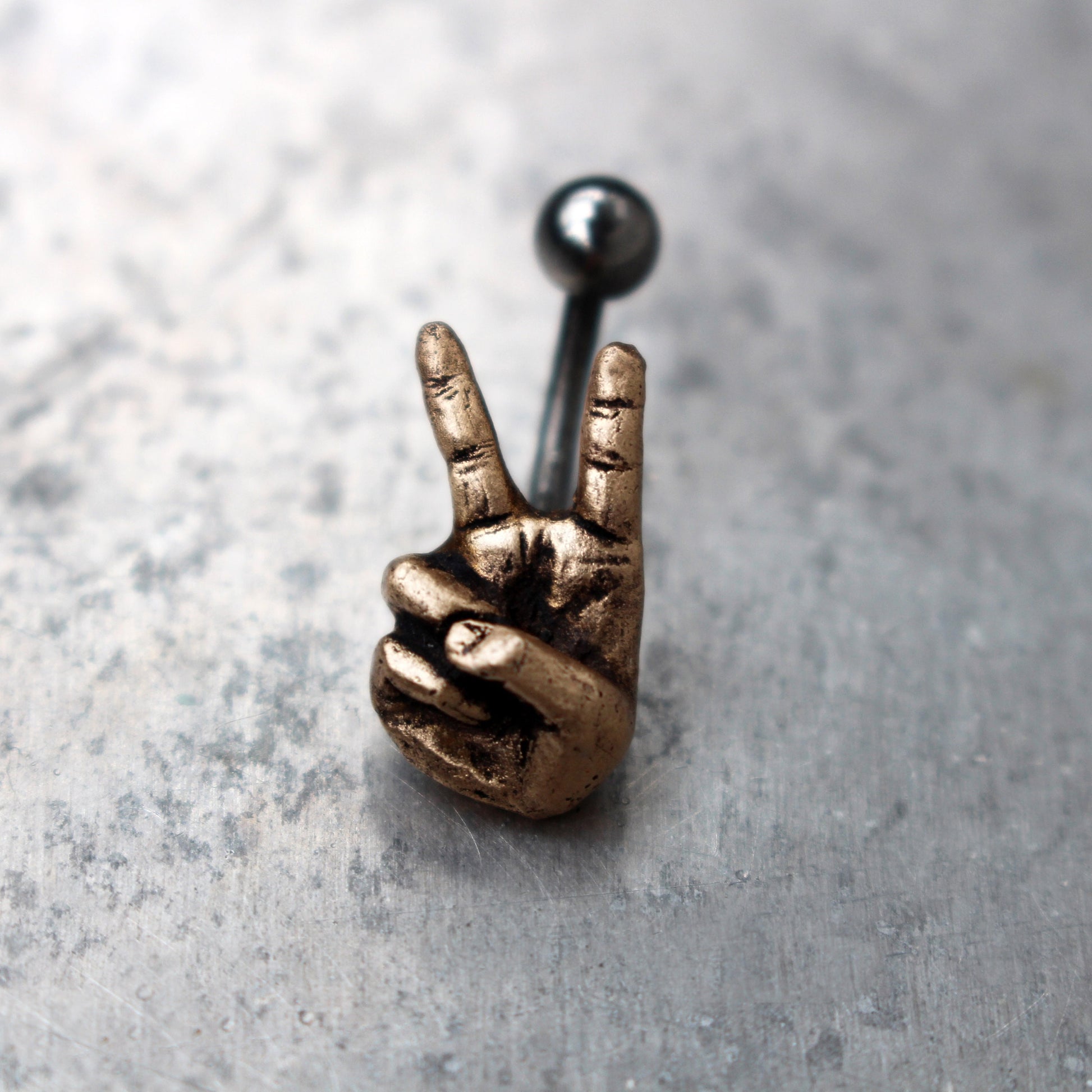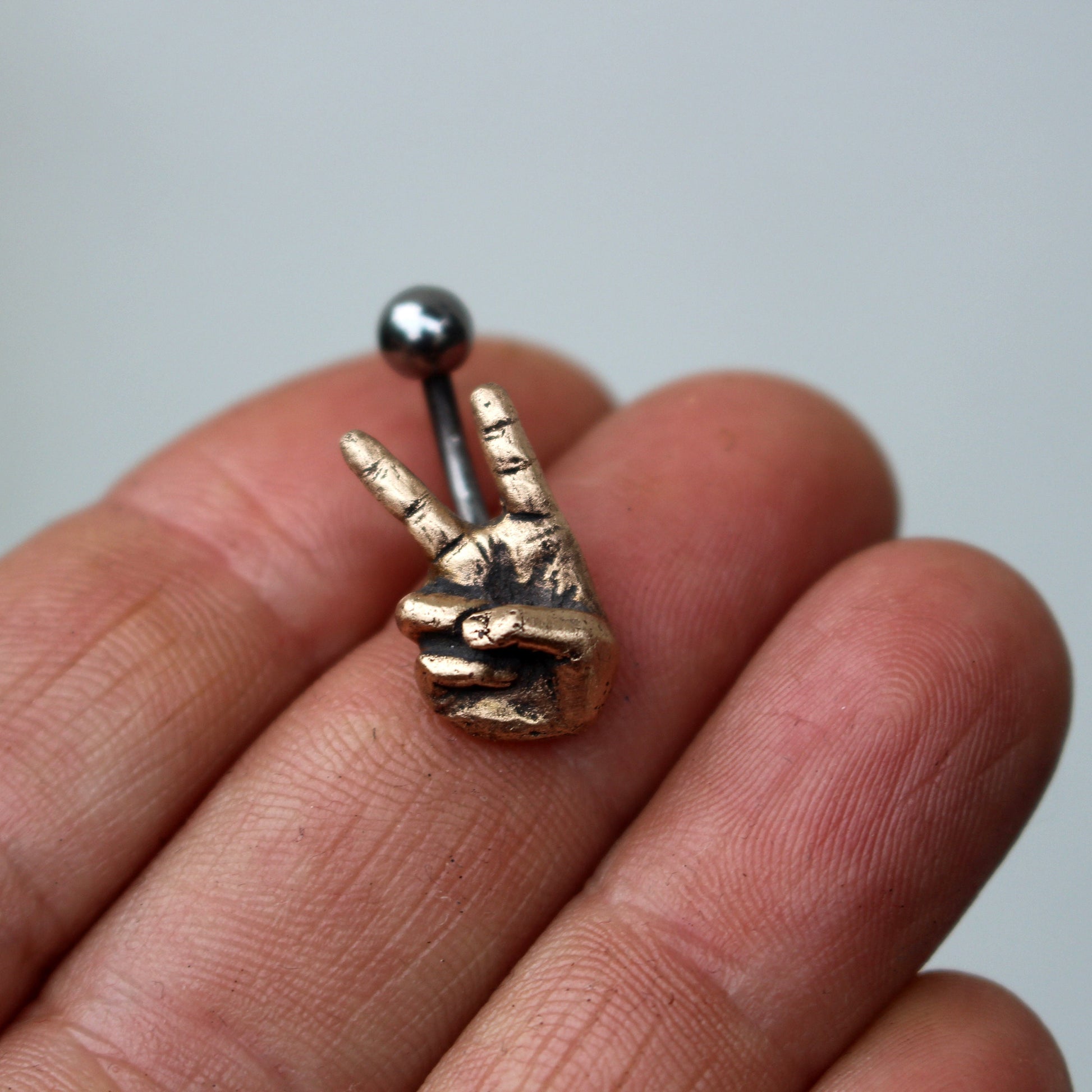 V är för seger hand navelring. Jag älskar händer, det är de bästa verktygen vi människor har. Miniatyrhanden är skulpterad av mig i brons. Ena änden av en 1,6 mm (14 gauge) böjd stav är ingjuten inuti i baksidan av handen. Jag gör stången ca 1 cm lång utan böjning, vill du ha en annan längd hör av dig vid beställning. Vill du ha en annan längd? Meddela mig vid beställning.