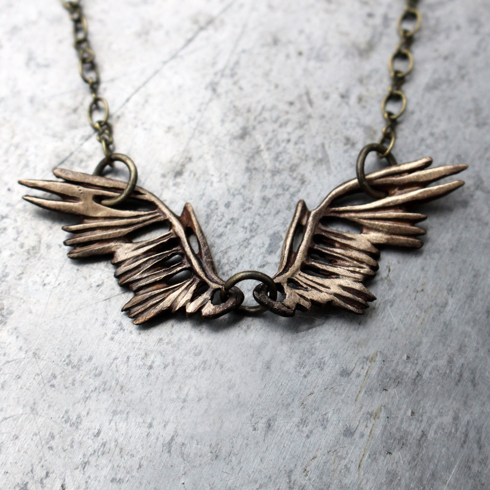 Vingarna är snidade med ett fjädermönster på båda sidor. De är gjorda i massivt brons. Vingarna sitter på en justerbar mässingskedja – välj mellan en kort (över bysten) eller lång (under bysten) variant.