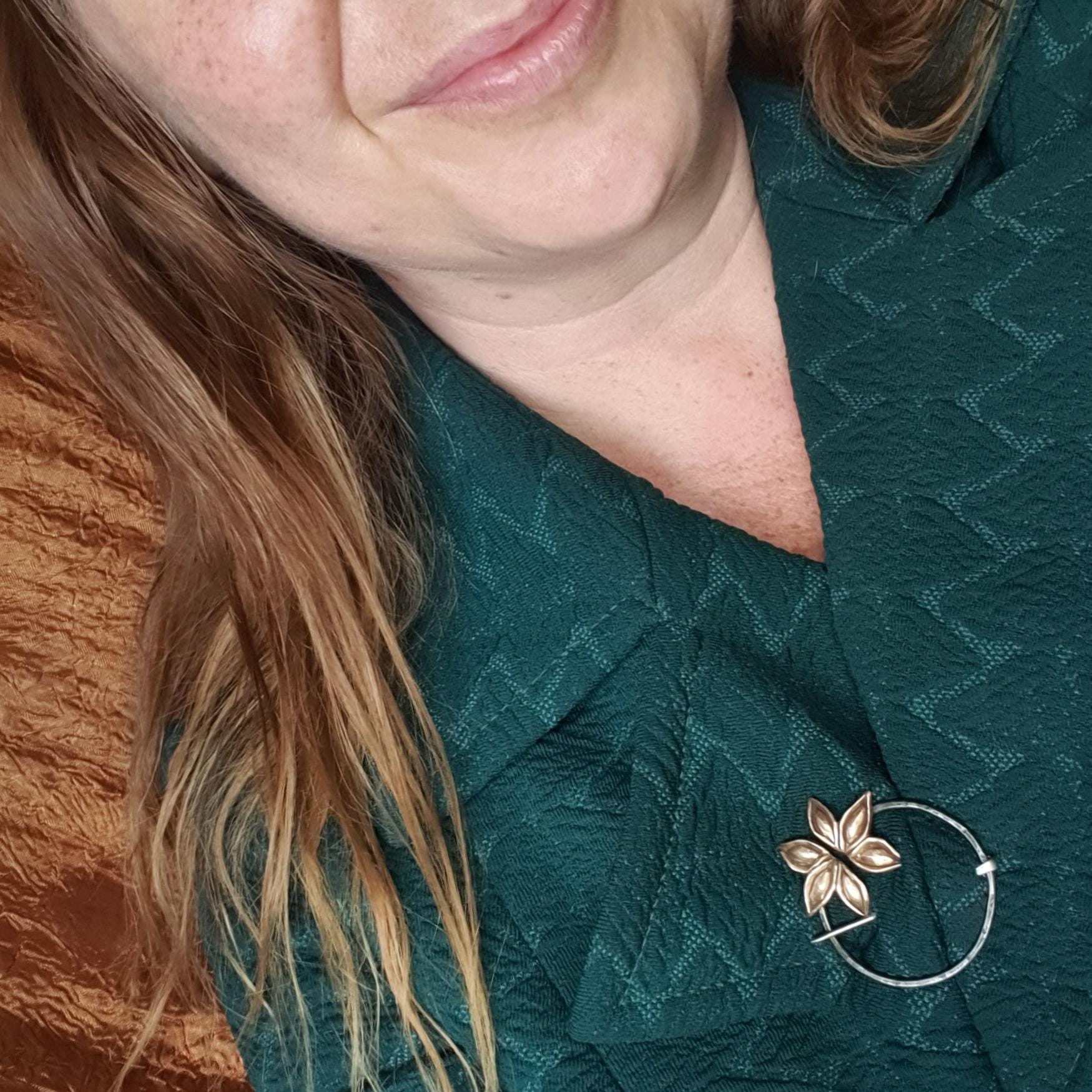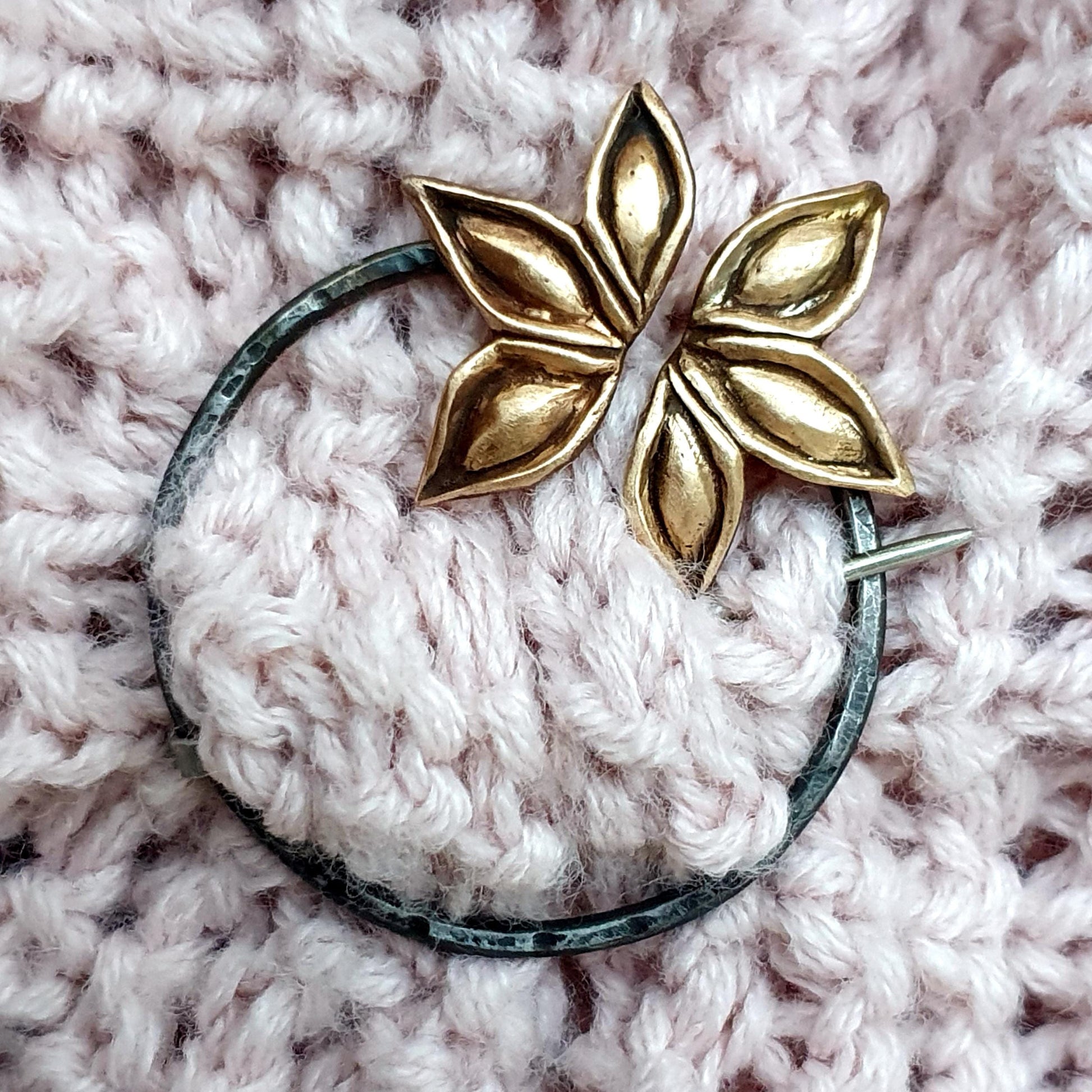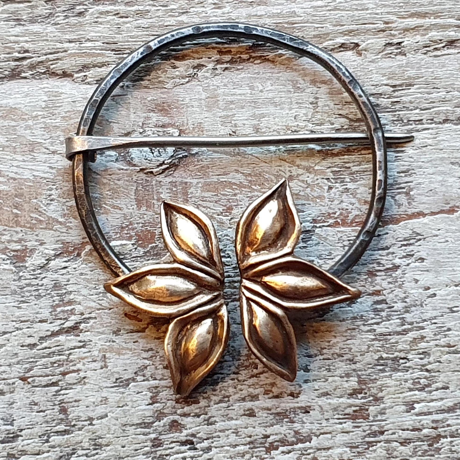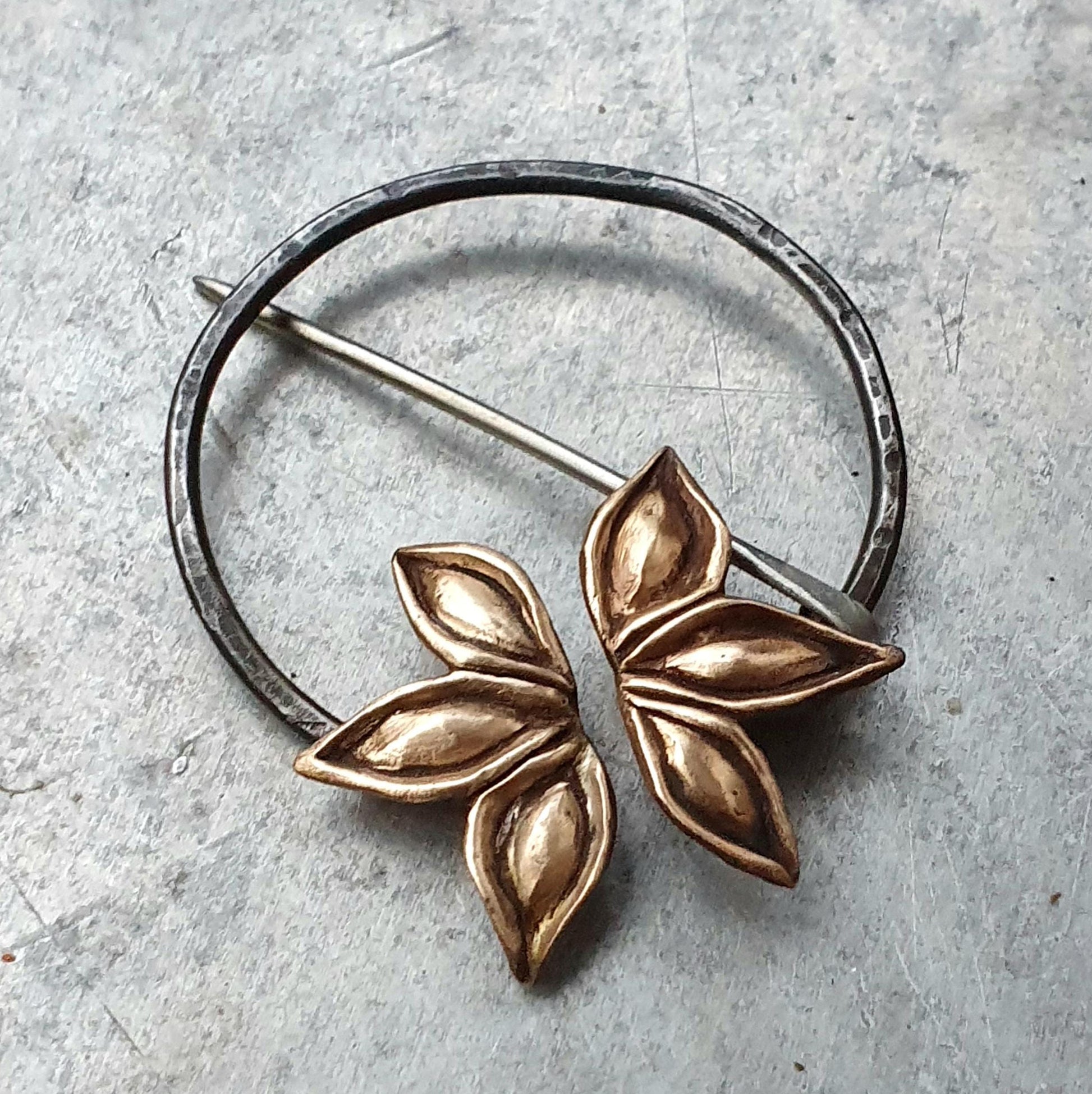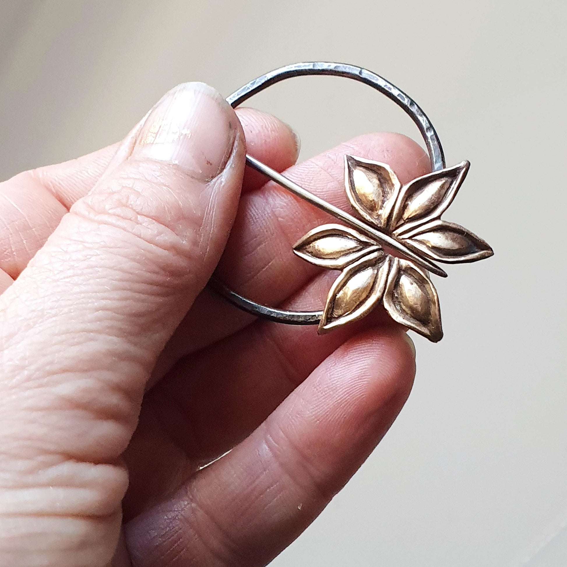 Kan användas som schalnål, på en hatt eller i håret. I denna smarta design finns en smal öppning i mitten av frökapseln för nålen att passera igenom. Cirkeln och nålen är smidda i rostfritt stål.