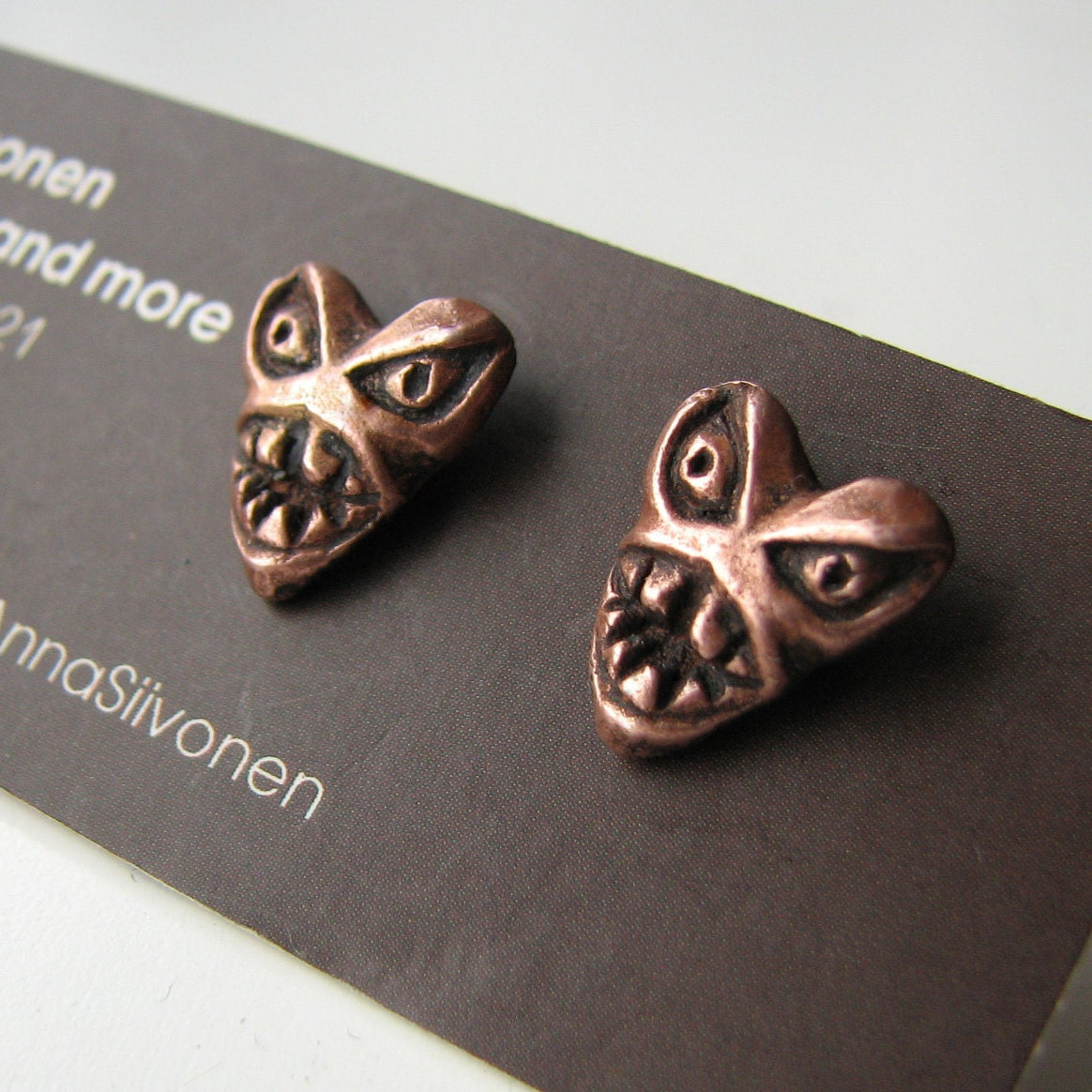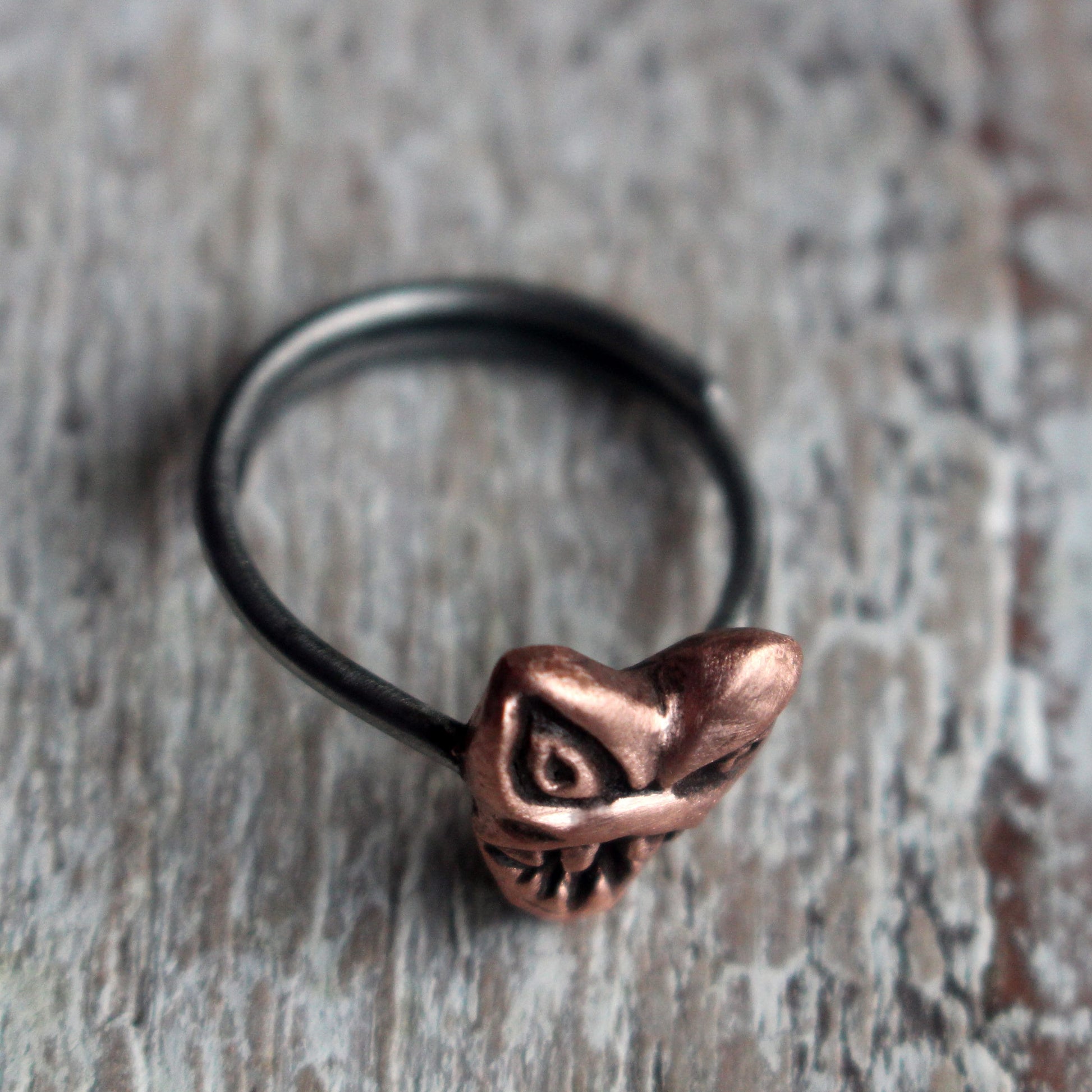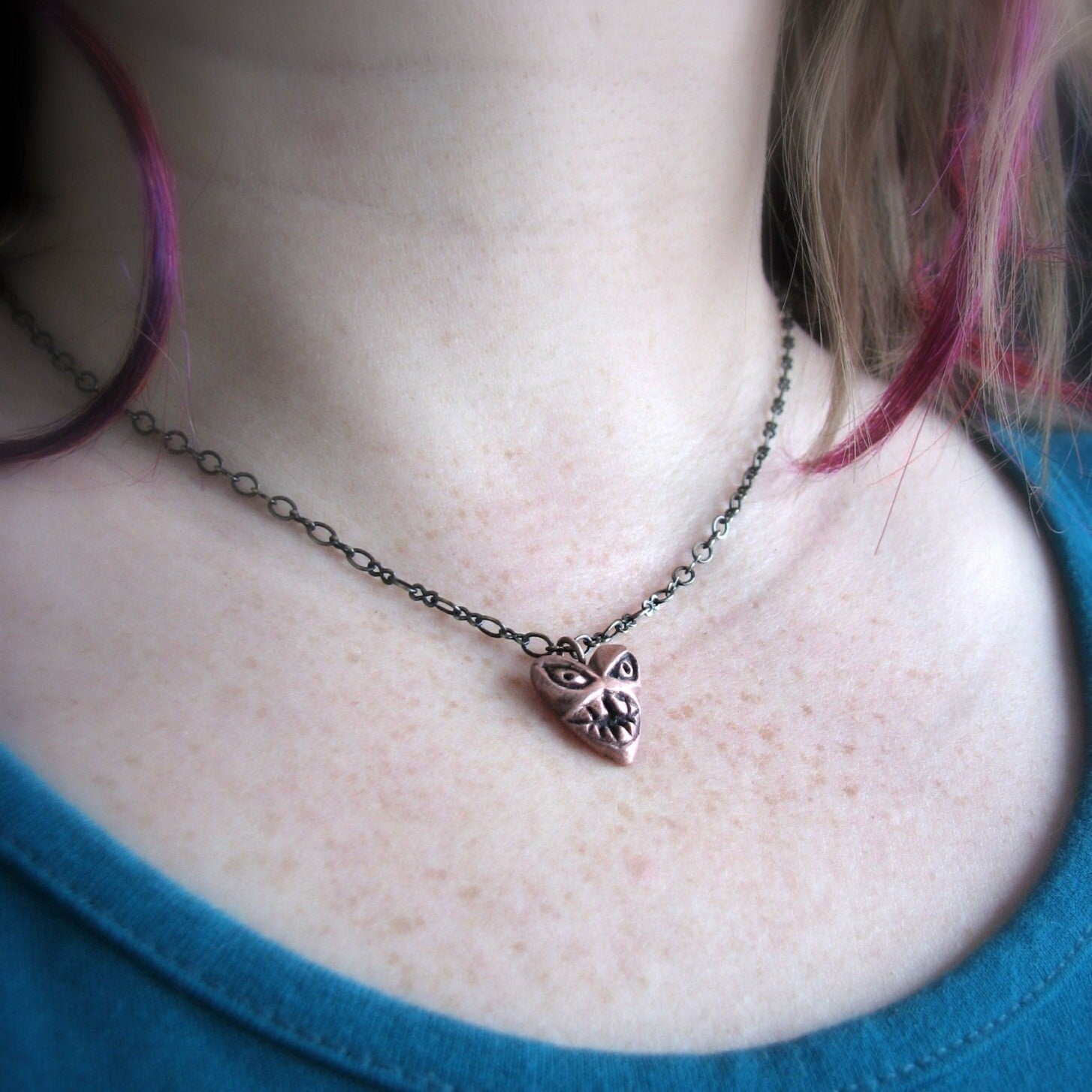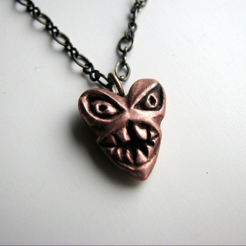 Detta vildsinta monsterhjärta är redo att bita tillbaka. Hänget är tillverkat av solid koppar som jag oxiderade och polerade för att förstärka detaljer. Metallen är skyddad med slitstark lack.