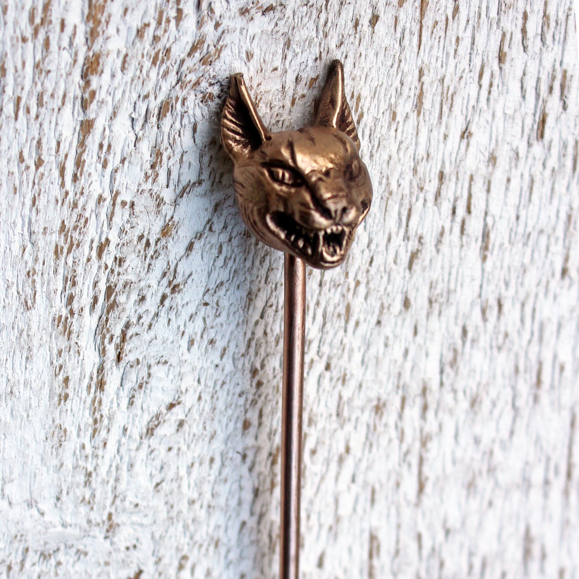 En hårpinne i brons med huvudet av en rytande vildkatt. Jag har skulpterat kattens huvud i massivt brons, och pinnen är också i brons.